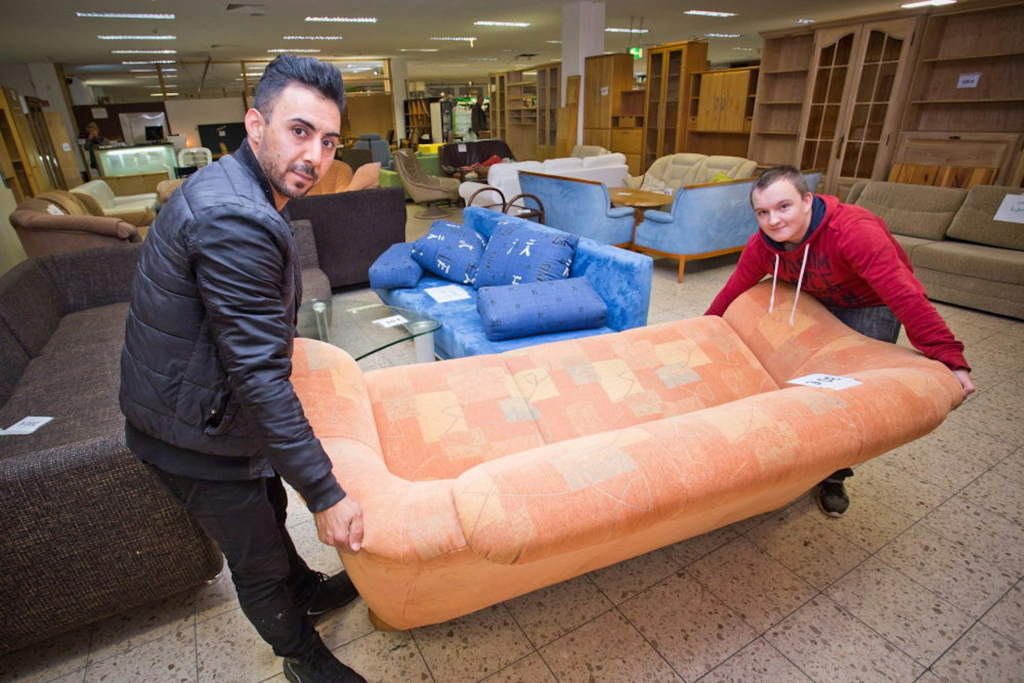 Auch Jamshid Hassan hilft beim Übersetzen, wenn Kunden nicht zurechtkommen, denn er spricht Kurdisch, Arabisch und Dari, die in Afghanistan gesprochene persische Sprache. Der Afghane (26) arbeitet seit Juni fest in der Möbelabteilung: „Drei Jahre habe ich bei der Tafel gearbeitet, nun hier im Kaufhaus. Und ich fühle mich wohl.“ Björn Szarata geht Jamshid Hassan derzeit zur Hand.