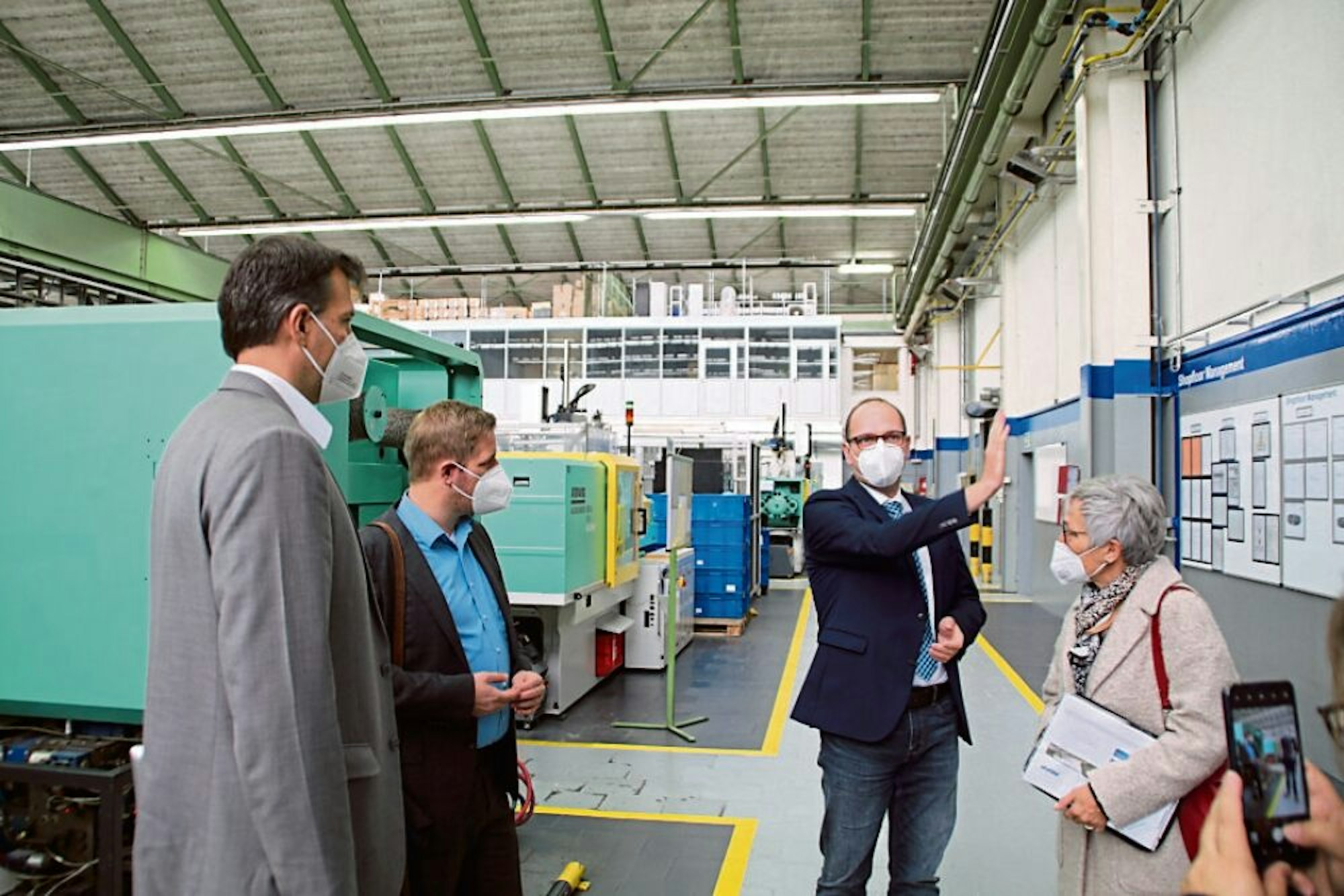 Eine neue Maschine ausprobiert: Schichtführer Stefan Wiskirchen erklärt Landrat Markus Ramers die Arbeitsschritte.