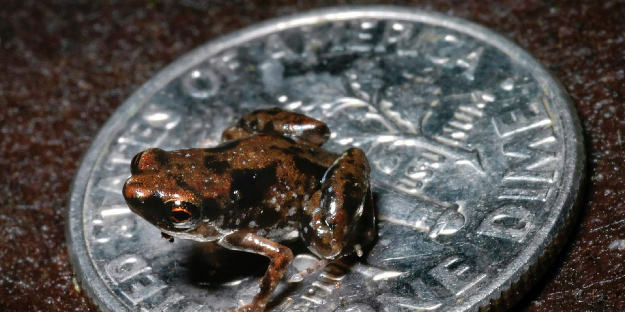 Ein winziger Frosch sitzt auf einem zehn Cent Stück. Der nur sieben Millimeter große Frosch Paedophryne amanuensis ist jetzt das kleinste bekannte Wirbeltier der Welt. Damit hat es der Winzling auf die neue Liste der zehn skurrilsten Entdeckungen des Jahres 2012 geschafft. Das Tier stammt aus dem Regenwald von Papua-Neuguinea.