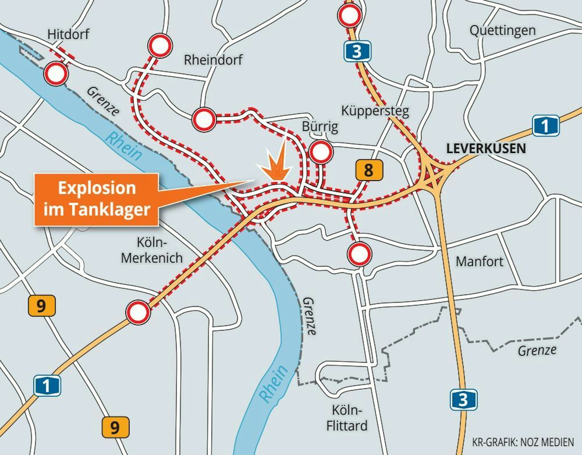 Was genau war nach den bisherigen Erkenntnissen passiert? Die Tankanlage im Entsorgungsgelände Bürrig war nach Angaben von Currenta aus bisher unbekannter Ursache gegen 9.30 Uhr explodiert. Danach kam es zu einem Brand in dem Tanklager, der erst nach Stunden um die Mittagszeit herum von den Feuerwehreinheiten gelöscht werden konnte. Die Bevölkerung wurde angewiesen wegen möglicher gesundheitsgefährdender Gase Fenster und Türen zu schließen und in ihren Wohnungen und Büros zu bleiben, bis die Gefahr vorüber ist.