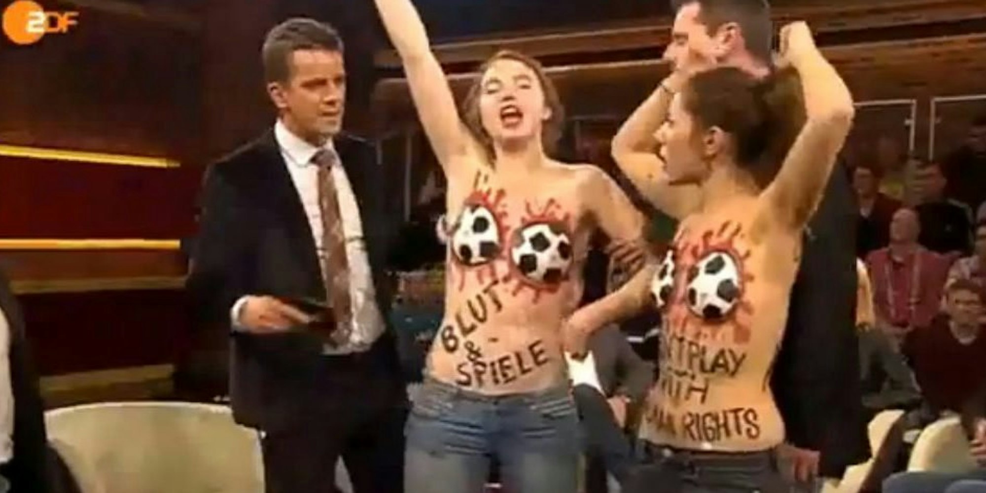 Hamburg – Nackter Protest gegen Fußball-WM-Gastgeber Katar bei „Markus Lanz“: Während der Live-Talkshow am Mittwochabend im ZDF haben zwei teils unbekleidete Frauen gegen die Arbeitsbedingungen in dem Land demonstriert. Die Frauen gingen mitten in der Sendung mit nackten Oberkörpern auf die Bühne - um ihre Brüste waren Fußbälle aufgemalt. Sie sprangen zwischen den Gästen auf und ab und skandierten „Boykott, FIFA, Mafia“. Auf ihren Bäuchen standen die Slogans „Blut & Spiele“ sowie „don't play with human rights“ - „Spiele nicht mit Menschenrechten“. Die Frauen wurden von Sicherheitsleuten aus dem Studio gebracht.
