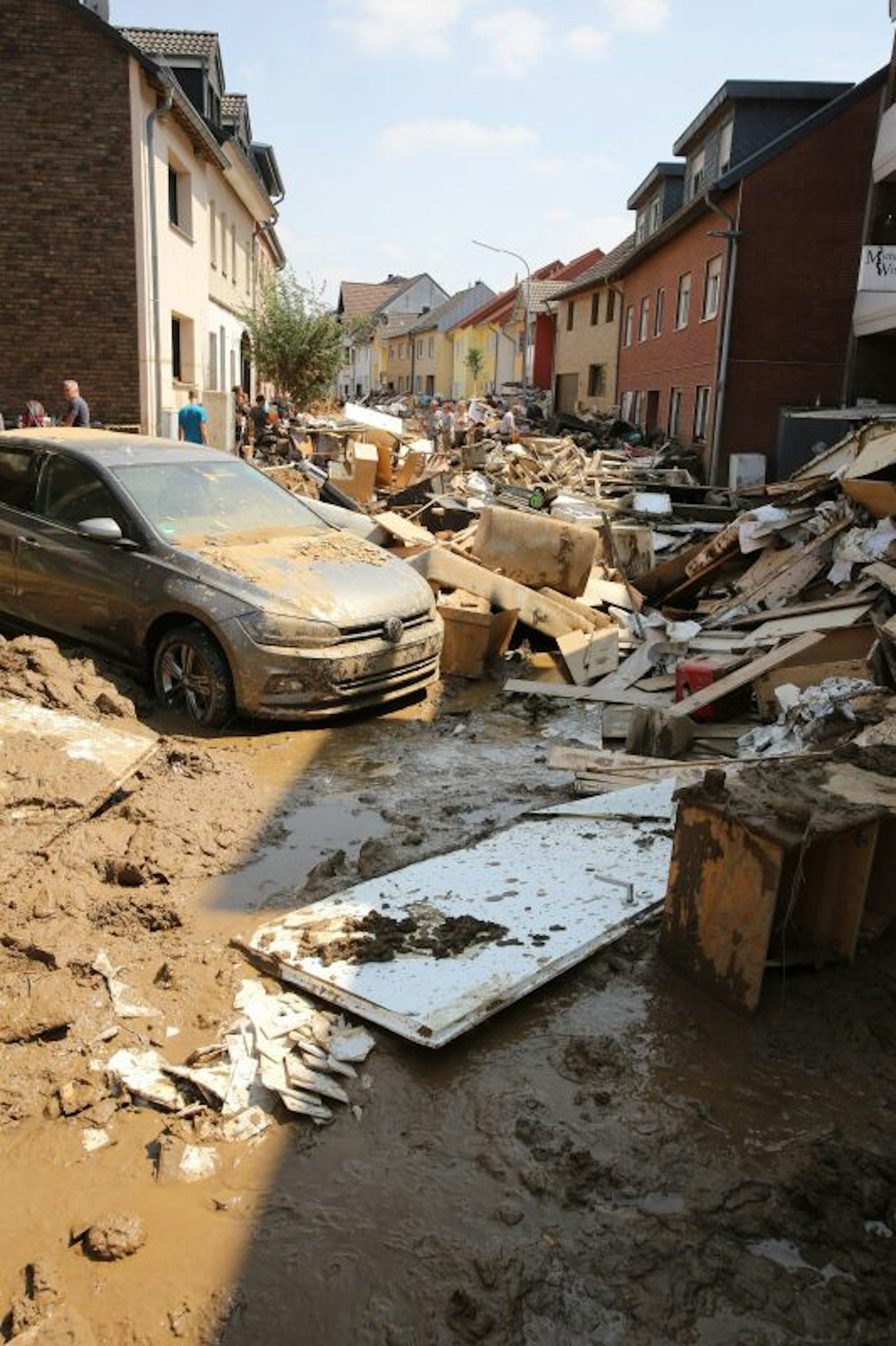 Wenige Tage nach der Flutkatastrophe war die Frankenstraße in Swisttal-Odendorf von Schlamm und Sperrmüll bedeckt.