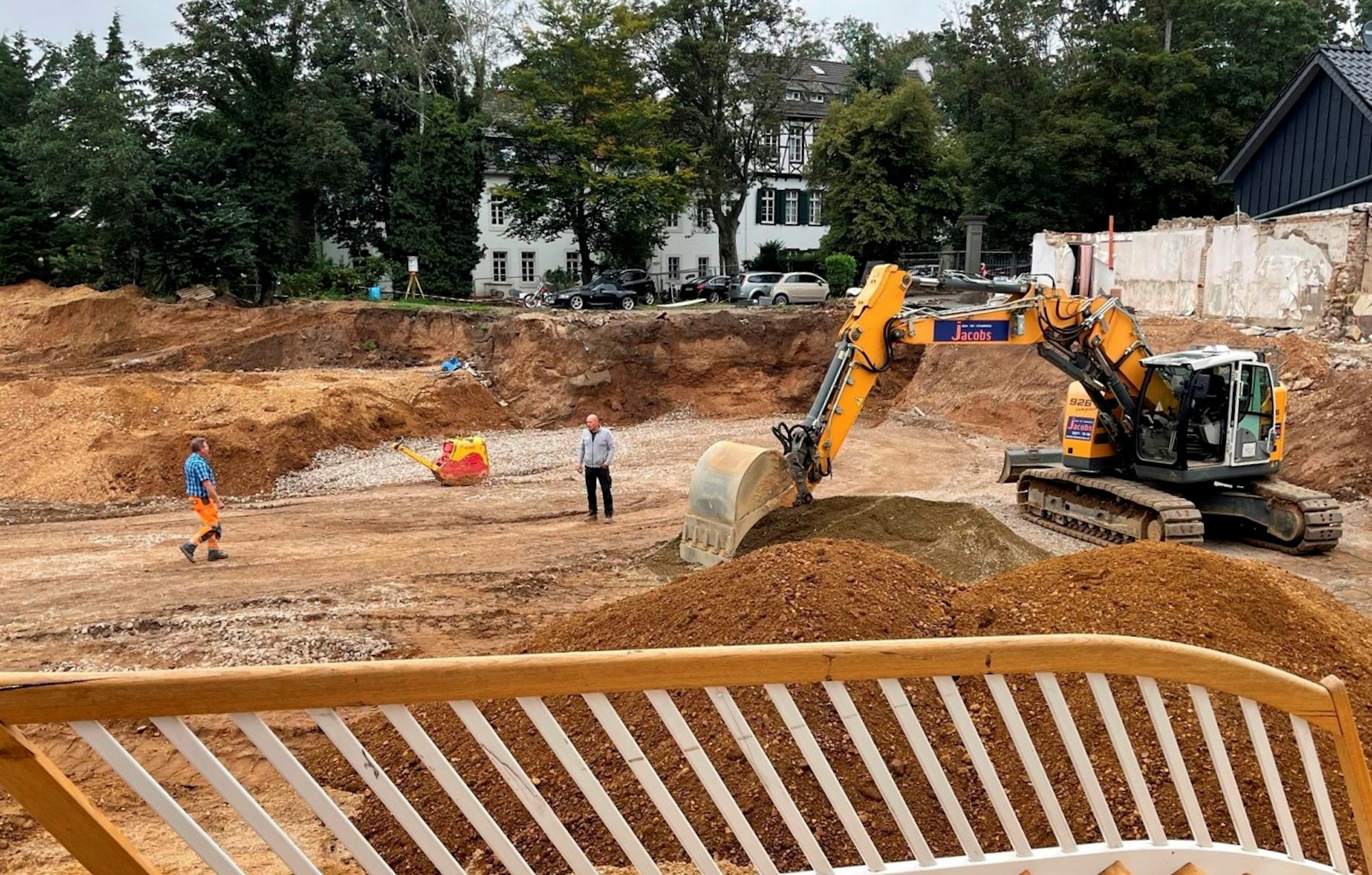 Über die Haustreppe eines ehemaligen Gebäudes schweift der Blick auf die Großbaustelle.