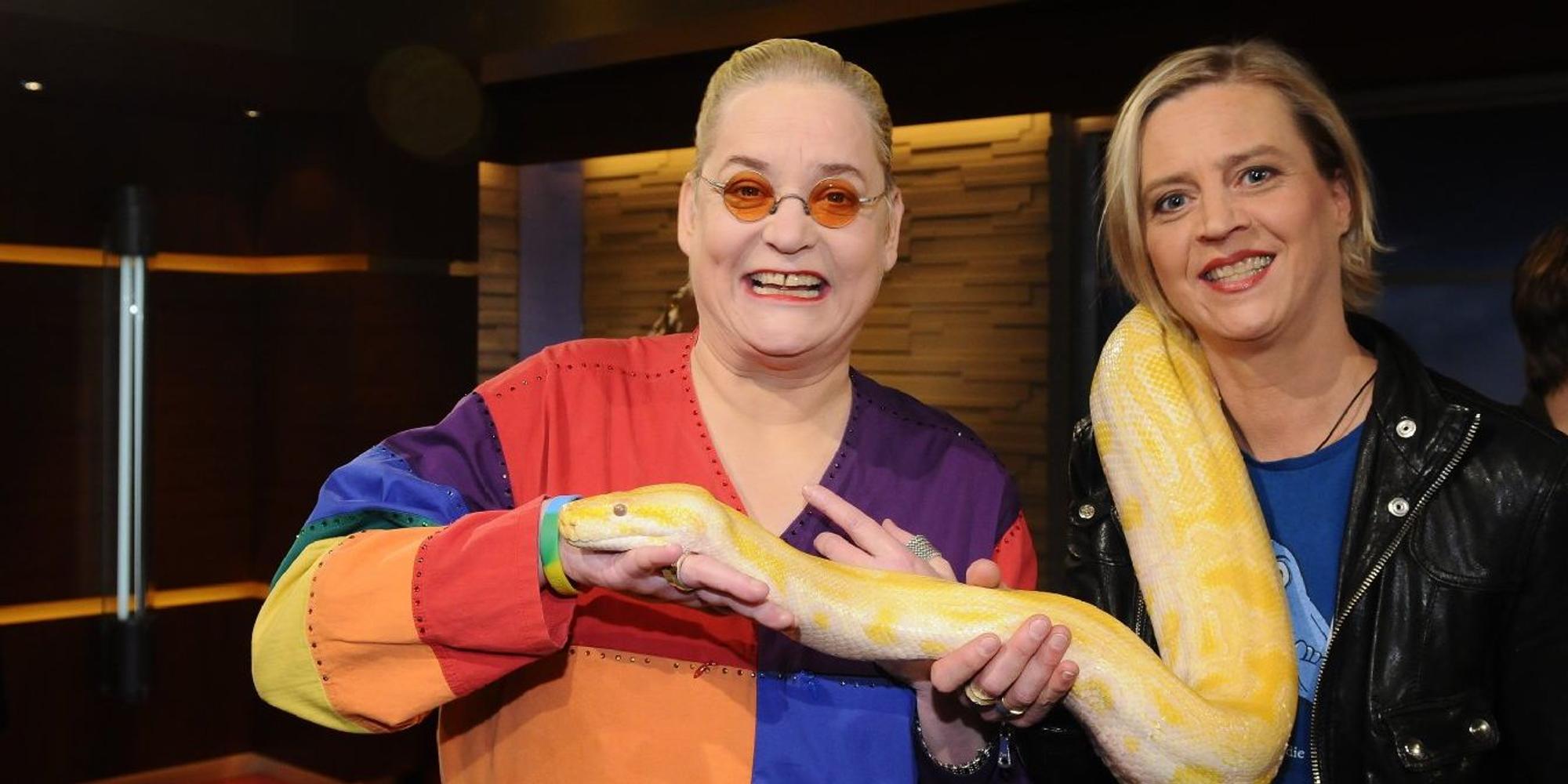 Hella von Sinnen und Cornelia Scheel mit Schlange zu Gast bei der ARD-Talkshow "Menschen bei Maischberger" am 08.11.2011 in Köln.