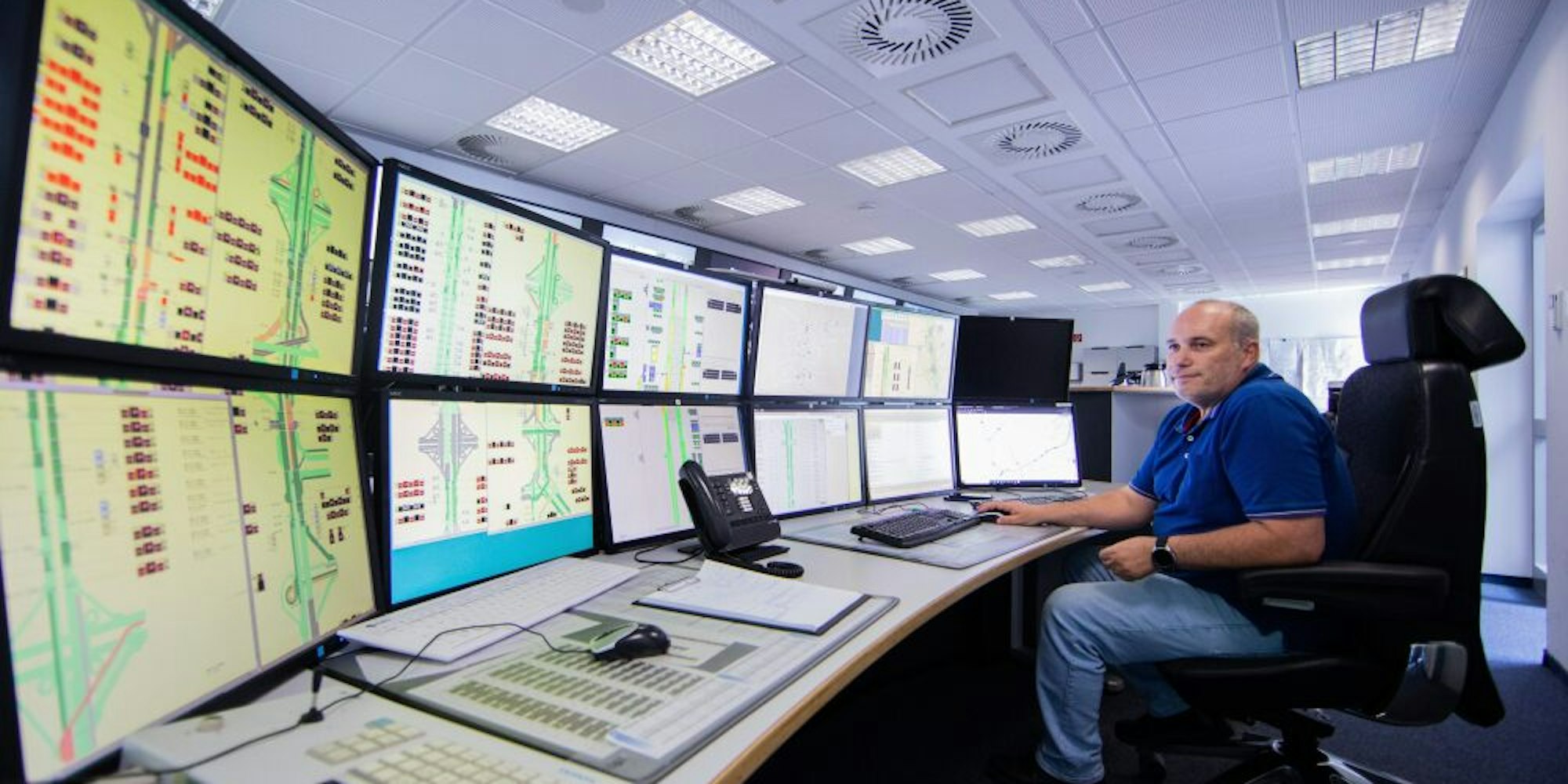 Zwölf Bildschirme hat Branco Seromenho in der Verkehrsleitzentrale in Leverkusen ständig im Blick.