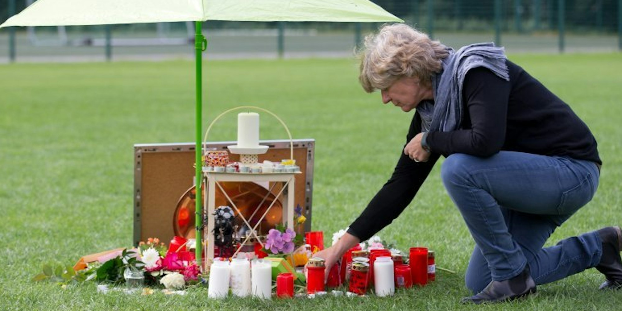 Schulleiterin Petra Hakenberg kniet vor Kerzen und Trauerbekunden in Gütersloh auf dem Sportplatz nahe der Janusz-Korczak-Schule. Ein 16-jähriger Zehntklässler war hier beim Speerwerfen im Sportunterricht in das eigene Wurfgerät gefallen und später seinen schweren Kopfverletzungen erlegen.