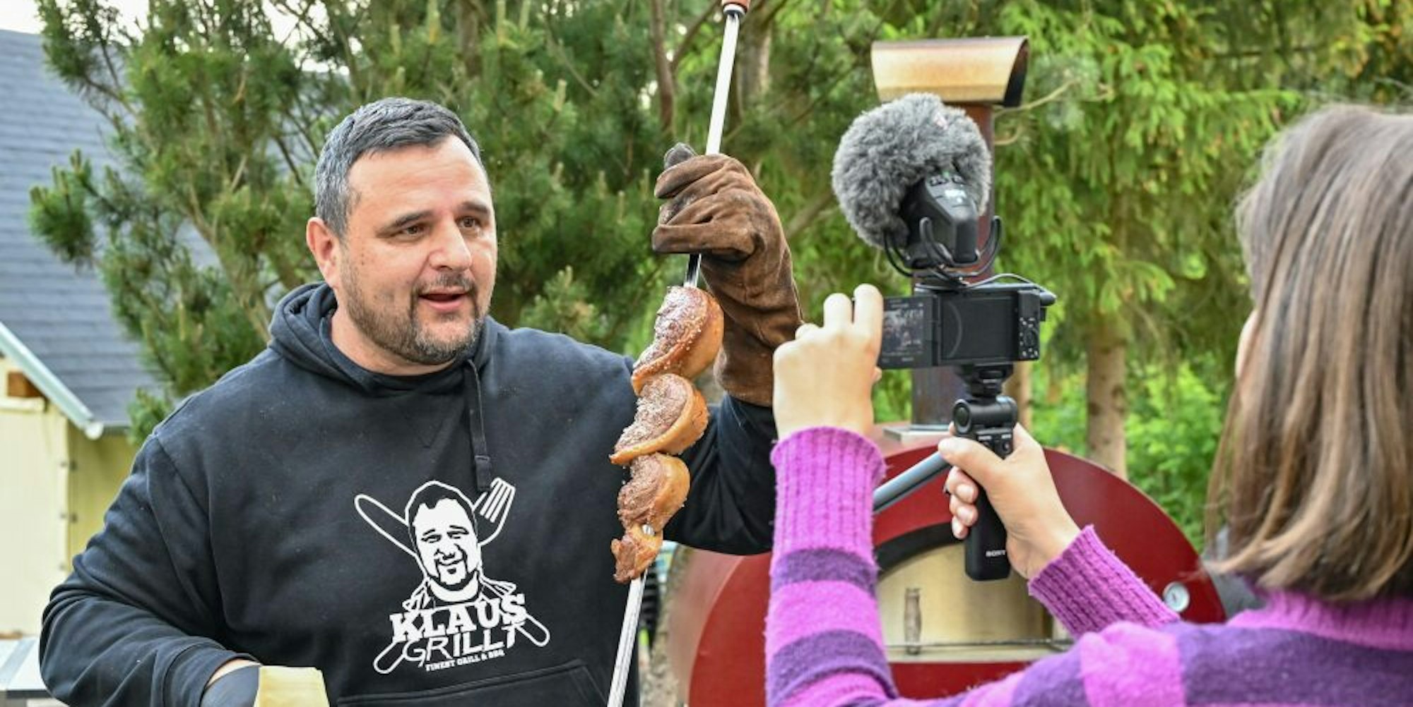 An der Kamera die Ehefrau: Klaus Glaetzner bei der Produktion eines neuen Grill-Videos.