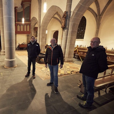 So tauchte etwa ein alter Fliesenspiegel auf, als die alten Podeste abgetragen waren. Den hätten die beiden zu gerne offengelassen, damit die Fliesen sichtbar sind. Doch der Denkmalschutz habe Einspruch eingelegt – und auf der vorigen Ausstattung bestanden. Der Eifeler Pragmatismus jedoch fand eine eigene Lösung. „Die ersten zwei Meter des Mittelpodestes können abgenommen werden, so dass dann die Fliesen sichtbar werden“, erläuterte Göbgen.