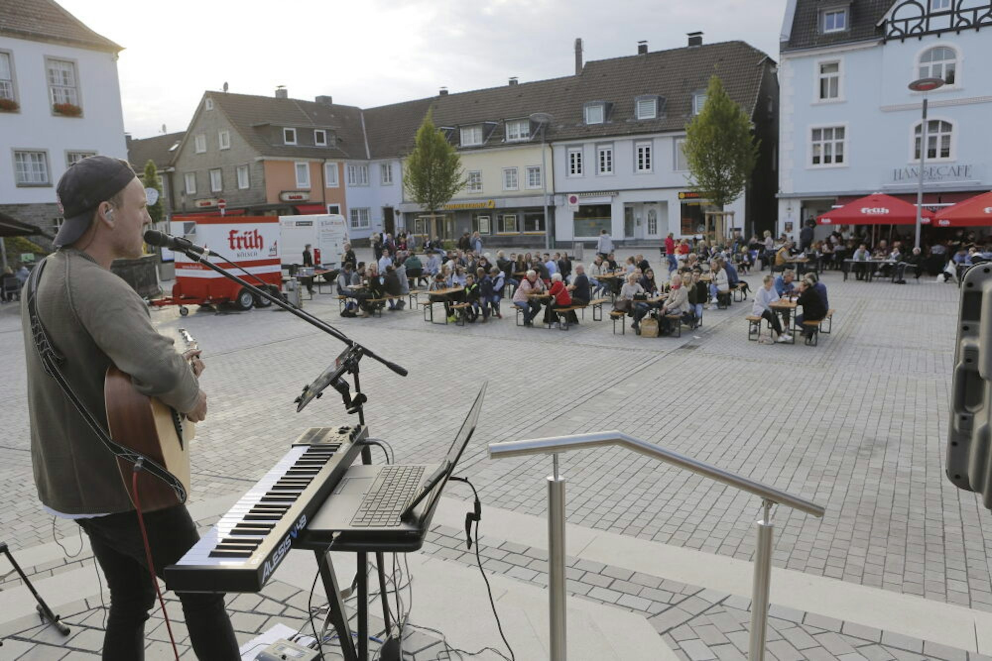 Philipp Hemmelmann spielt auf der neu gestalteten Freitreppe des Wipperfürther Marktplatzes.