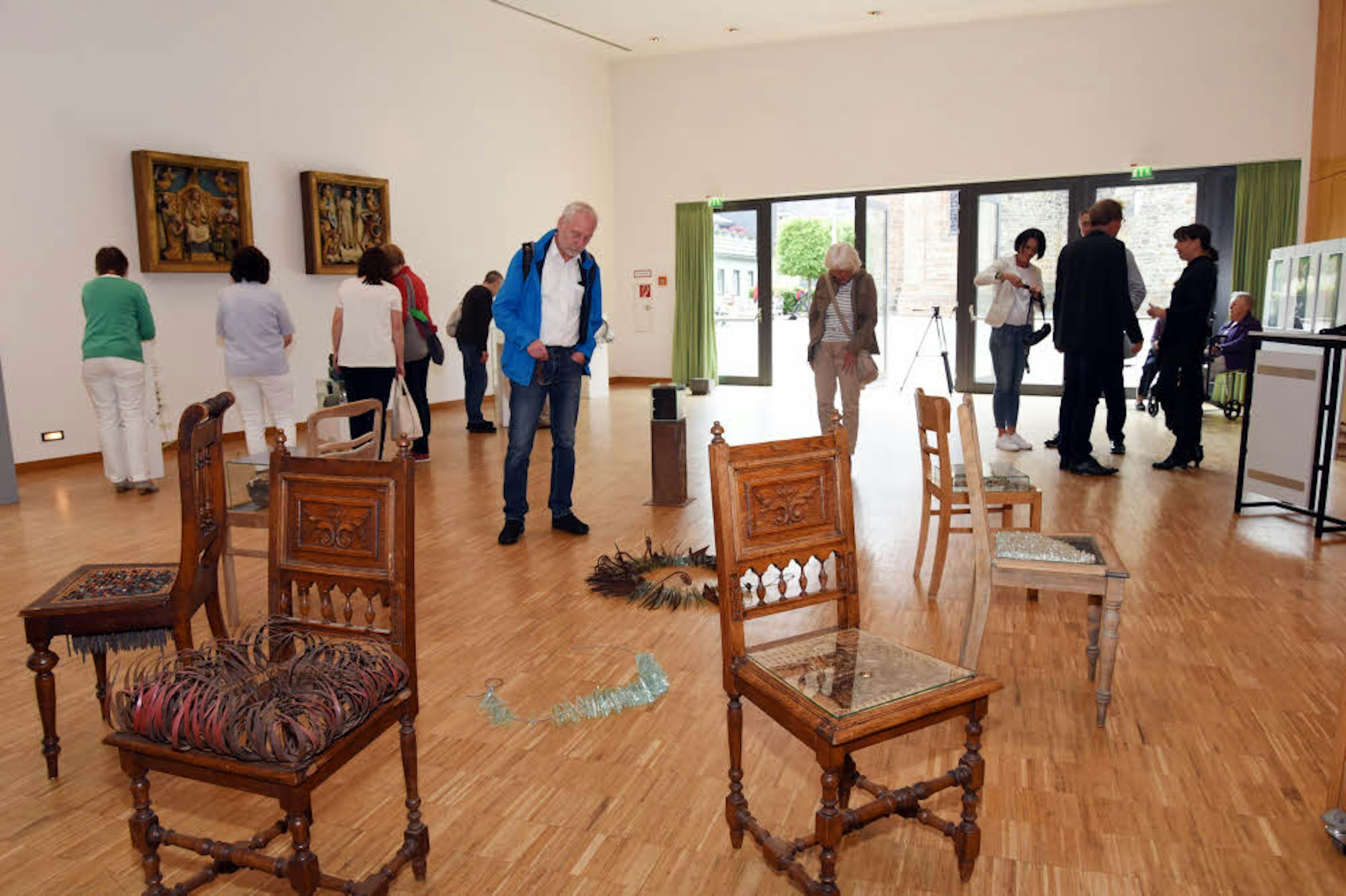 Die aus Kürten stammende Künstlerin Maria Schätzmüller-Lukas zeigt ihre etwa 25 Objekte im Pfarrheim sowie der katholischen Kirche: fragile und klare Glasimpressionen, sind im Materialmix mit Holz als durchsichtige Objekte zu bewundern. Stühle etwa, deren Sitzflächen gläserne Details aufweisen, sind zu einem Kreis aufgestellt. Auch einfaches Fensterglas wird von der Künstlerin zum geschichteten Objekt, und beschreibt die Klarheit und Schärfe des Materials.