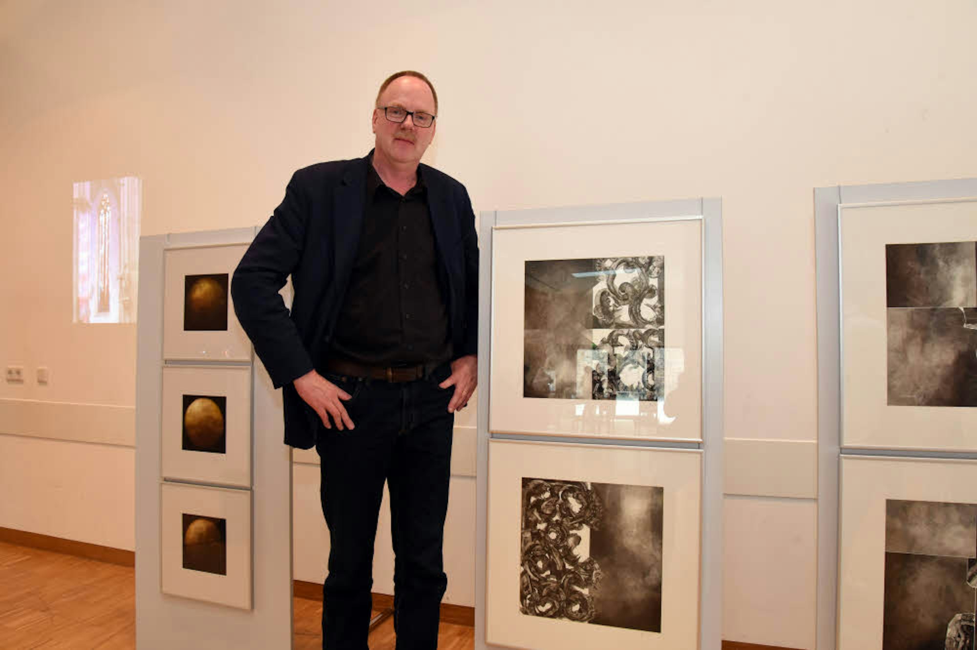 Der Künstler und gelernte Glasmaler Gerlach Bente aus Radevormwald zeigt im Pfarrheim seine kleinformatigen Quadraturen, die er als filigrane Ölmalerei und surreal anmutend, auf Karton aufbringt. Faszinierend sind dabei die transluzenten Details, die täuschend ähnlich zu der malerischen Technik auf Glas erscheinen. Auch zeigt der Künstler per Beamer seinen Wettbewerbsentwurf eines Kirchenfensters für das Ulmer Münster aus dem Jahre 2017.