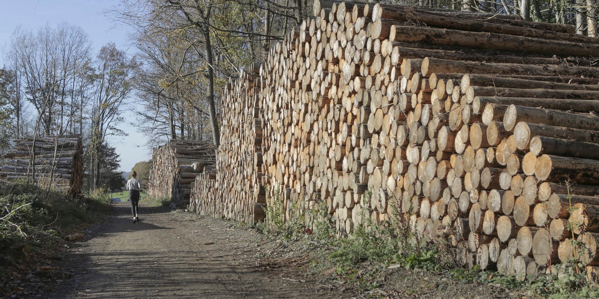 In Lindlar-Ost warten große Mengen geschlagenes Holz auf den Abtransport.