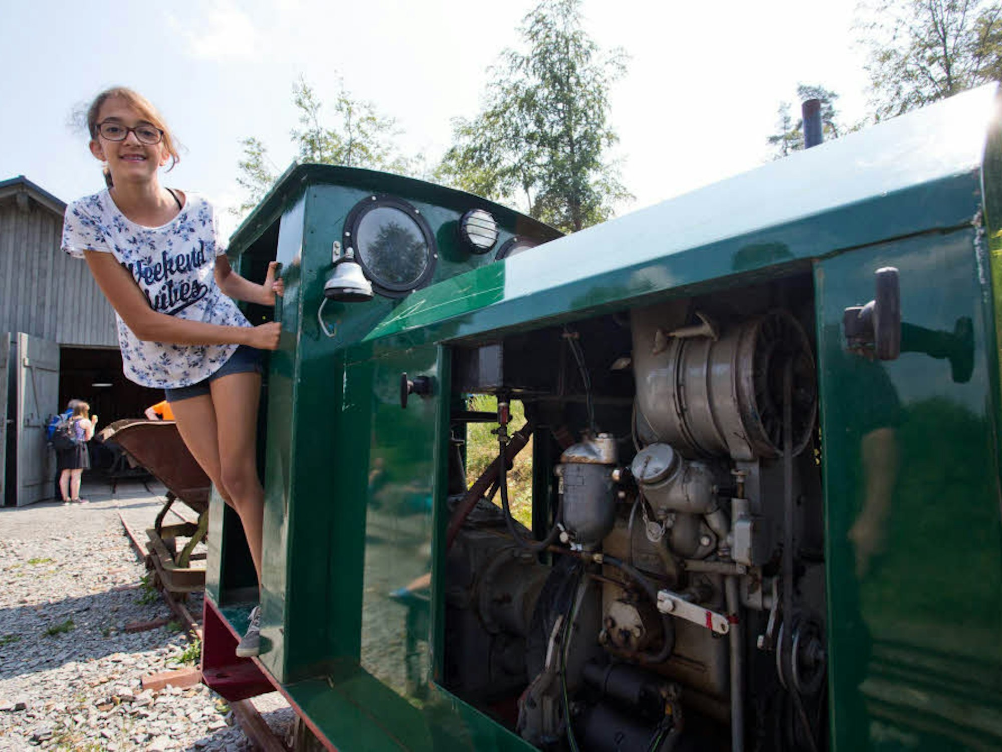 Den neuen Lokschuppen und die Feldbahn nimmt Milena im Freilichtmuseum genau in Augenschein.