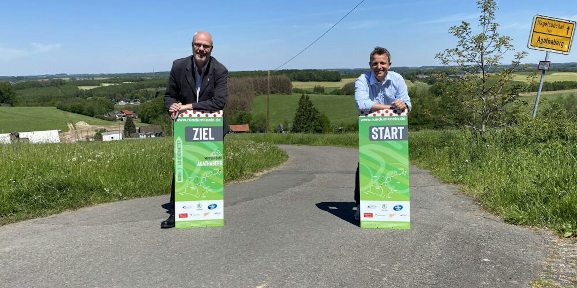 Ein Höhepunkt für die Radprofis ist seit Jahren der Anstieg nach Agathaberg. Es ist der längste Anstieg auf der Tour und eine wichtige Bergwertung. Heribert Berster, erster stellvertretender Bürgermeister von Wipperfürth, war mit Markus Frisch beim Fototermin vor Ort: „Wir freuen uns, dass Rund um Köln dieses Jahr in Form der ,Bergischen Challenge' hier bei uns in Wipperfürth stattfinden kann. Auch wenn es leider zu Corona-Zeiten keine Eventpoints, wie am steilsten Anstieg der Strecke in Agathaberg oder in Thier gibt, werden die diesjährigen Teilnehmer, und da bin ich mir sicher, von vielen Wipperfürthern auch ohne diese Treffpunkte zu Höchstleistungen angefeuert werden. Umso mehr freuen wir uns auf das nächste Jahr, wenn hoffentlich wieder ein normales Rennen Rund um Köln mit vielen Zuschauern und den Eventpoints stattfinden kann.“