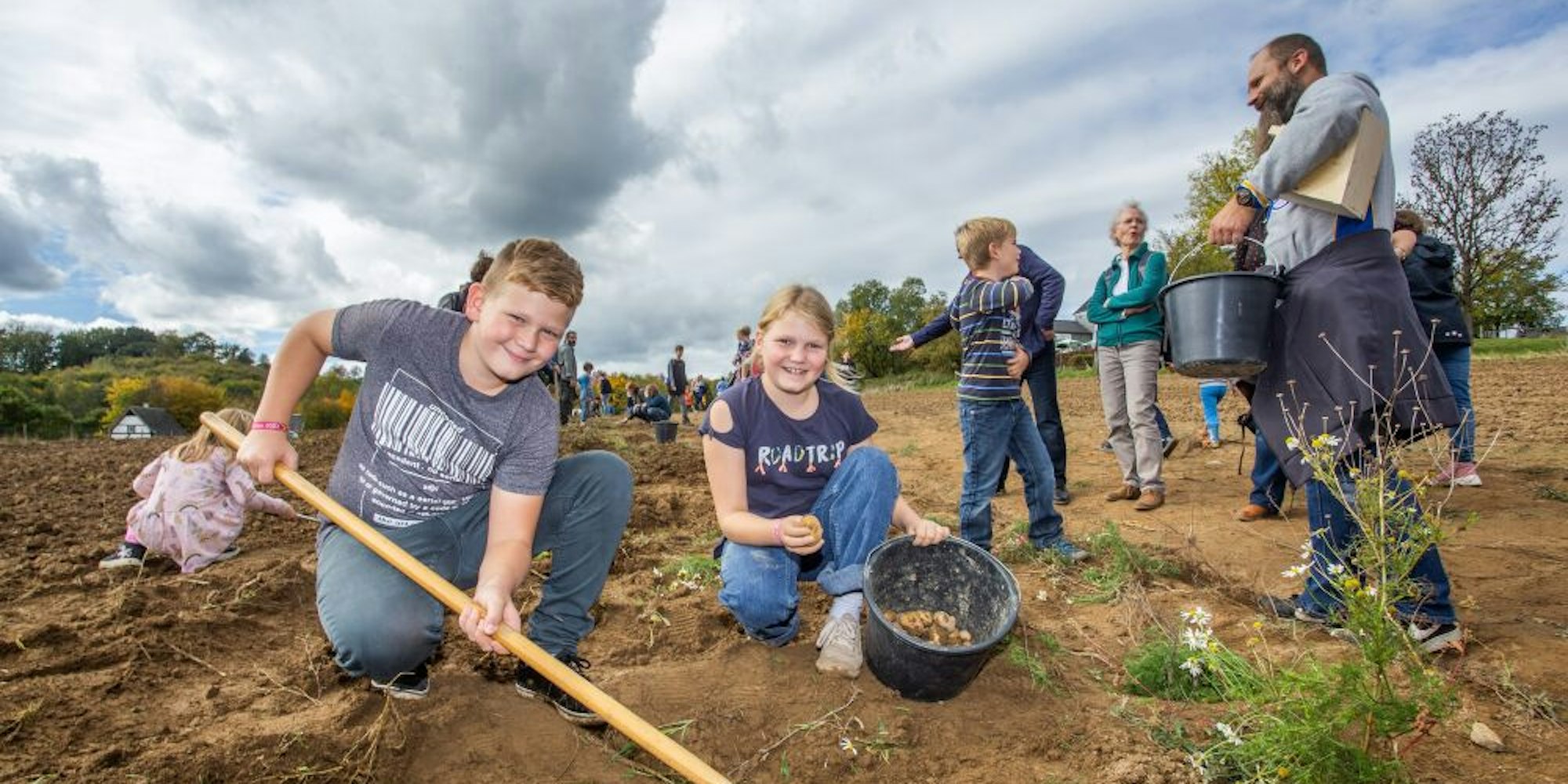 Auf einem der Felder, des 37 Hektar großen Freilichtmuseums, sammeln währenddessen Katja (10) und ihr Bruder Oliver (12) aus Bergisch-Gladbach, Kartoffeln aus einer vom Trecker aufgetanen Reihe. Ein halber Eimer ist schon voll. Auch ganz winzige Kartoffeln, kleiner als ein Fingernagel, haben sie gefunden. „Die Kinder können die Kartoffeln sammeln und gegen eine Spende mitnehmen“, berichtetet Museumsgärtner Andreas Otto.