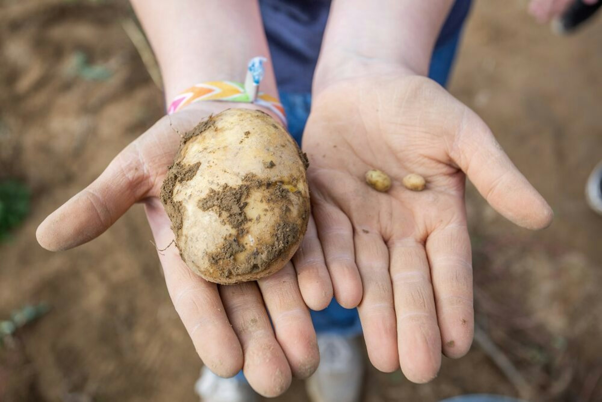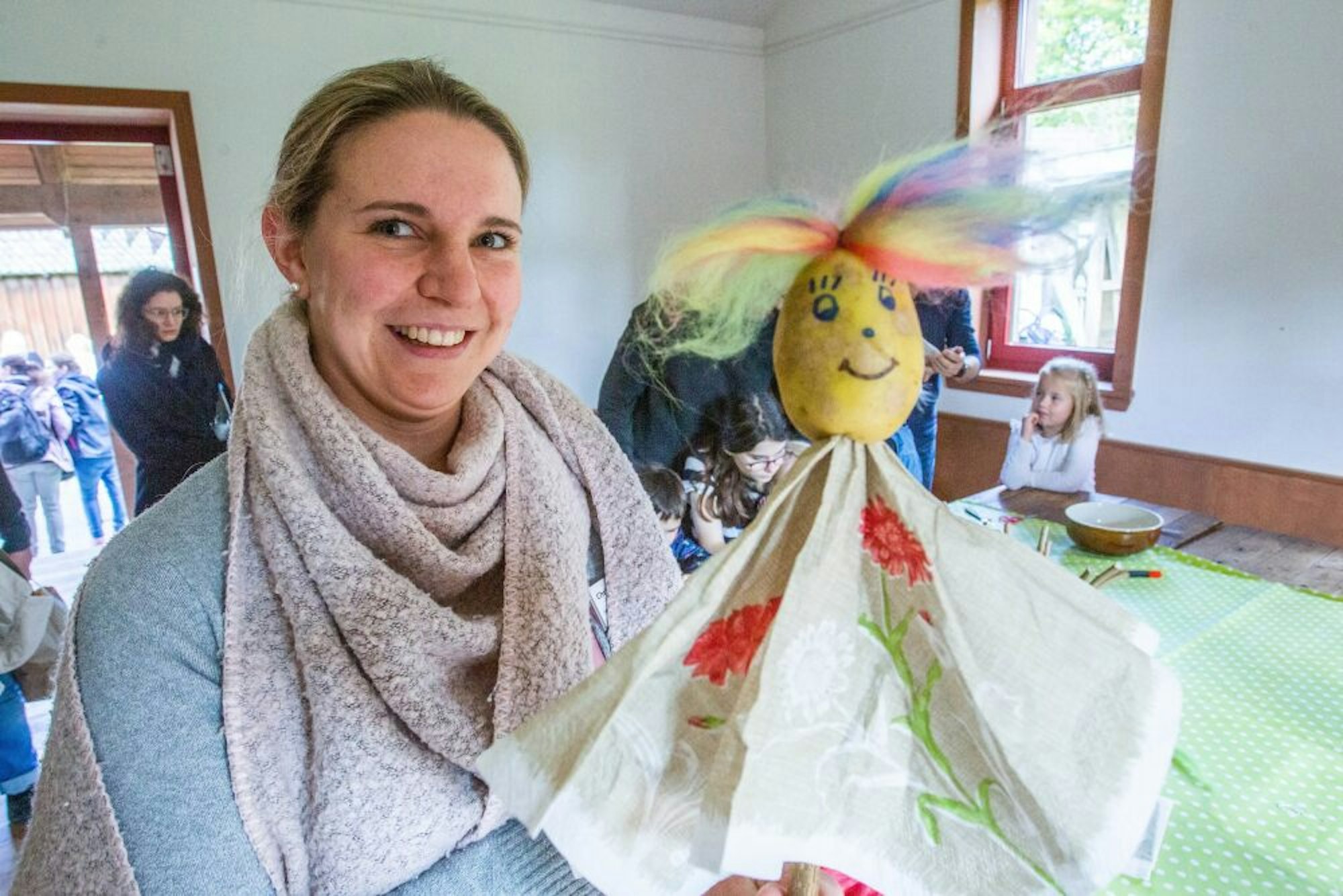 Das knisternde, früher gegen die Krautfäule genutzte Kartoffelfeuer im Anschluss an das Sammeln darf natürlich auch nicht fehlen. Ebenfalls zum Mitnehmen, allerdings nicht mehr zum Essen geeignet, sind die Kartoffelköniginnen, die Christina Marquardt mit den interessierten kleinen Besuchern bastelt.
