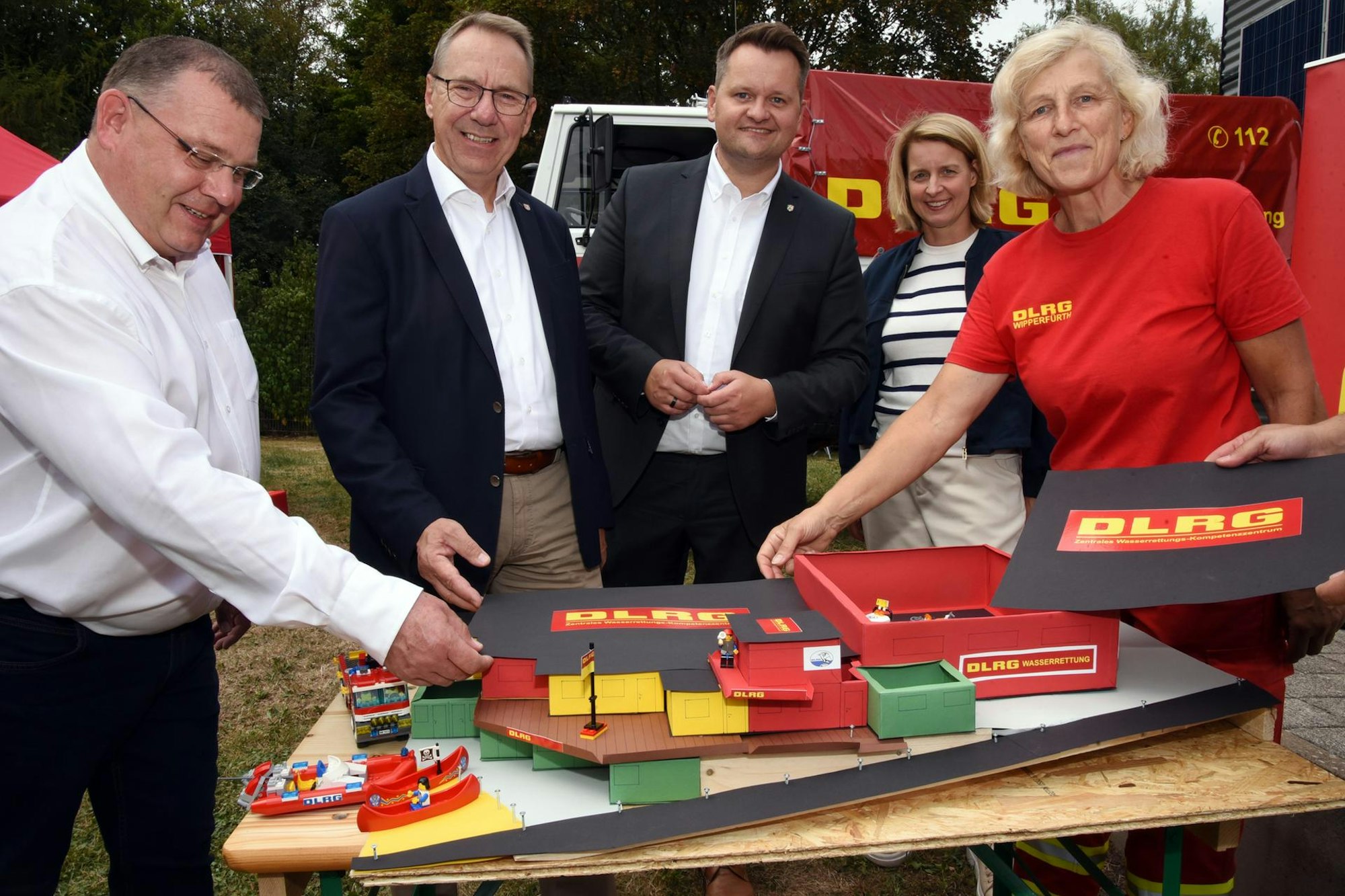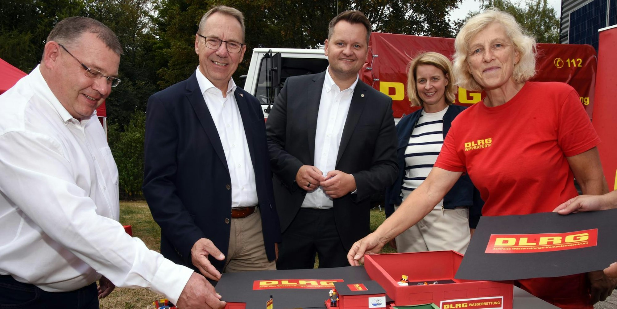 Heike Radder (r.) und Torsten Richling (l.) von der DLRG, Wipperfürths Bürgermeisterin Anne Loth, MdL Christian Berger (M.) und Landrat Jochen Hagt