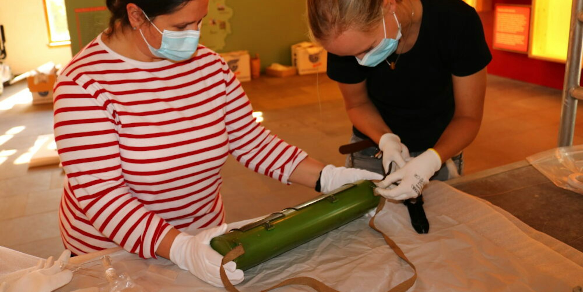 Sorgsam bereiten Anka Dawid-Töns und Astrid Beling (v.l.) eine Botanisiertrommel für eine Ausstellung vor.