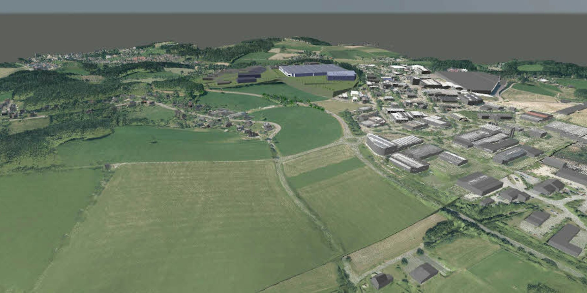 Das Industriegebiet Klause (rechts) und die geplante Erweiterung (Mitte) zeigt unter anderem die bestehende, große Lagerhalle von Holz Richter und den geplanten Neubau im Abschnitt Klause V.