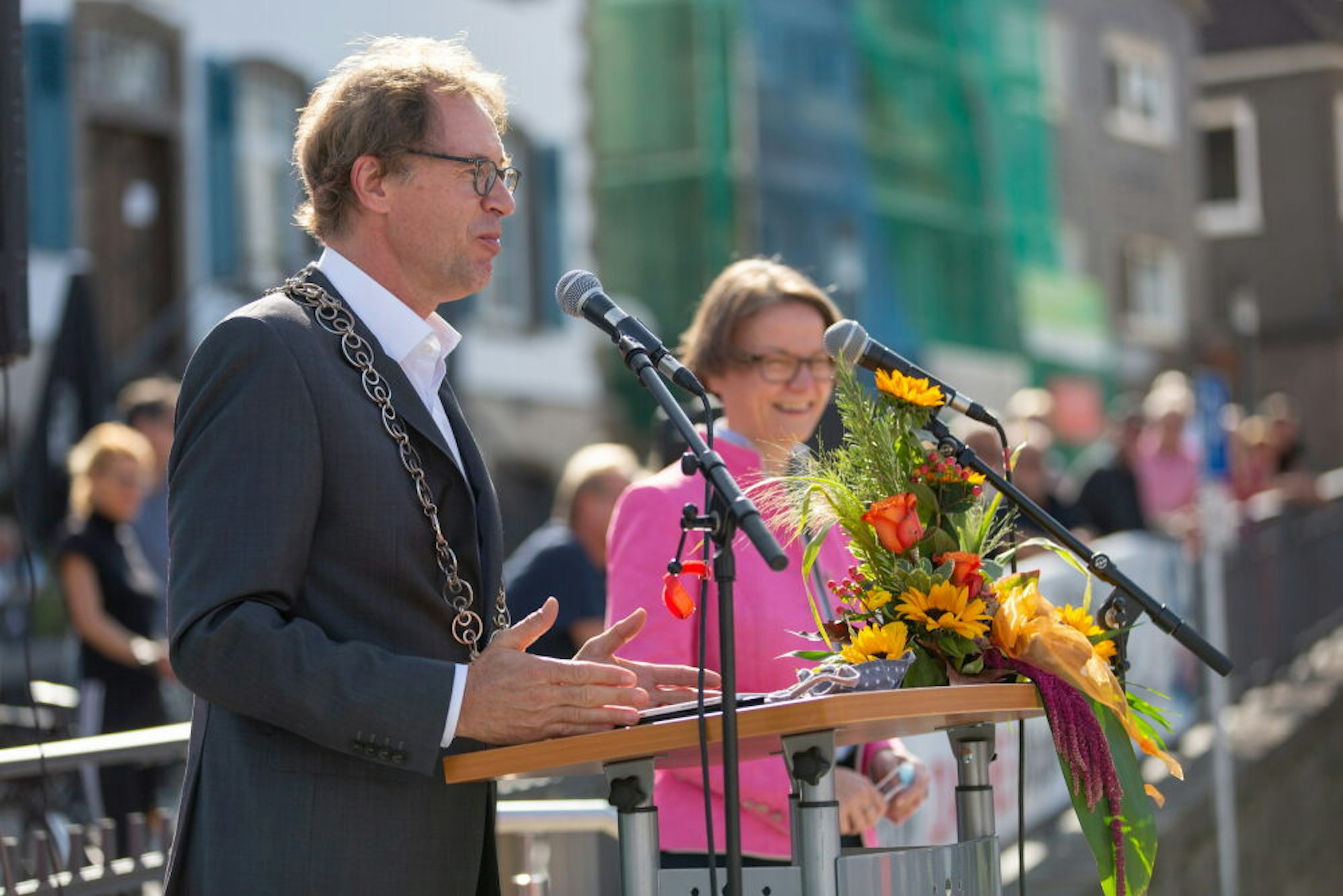 Auch Bürgermeister Michael von Rekowski ließ es sich nicht nehmen, bei einem seiner letzten offiziellen Termine als Bürgermeister ein paar Worte an die Marktplatzbesucher zu richten: „Ich habe erlebt, wie gerne die Menschen in Wipperfürth feiern. Und deshalb wollten wir die Einweihungsfeier auch nicht unter den Tisch fallen lassen.“ Michael von Rekowski nutze die Rede auch, um sich als Bürgermeister von den Bürgern zu verabschieden. Für seine Rede bekam er kräftigen Applaus von seinen Zuhörern.