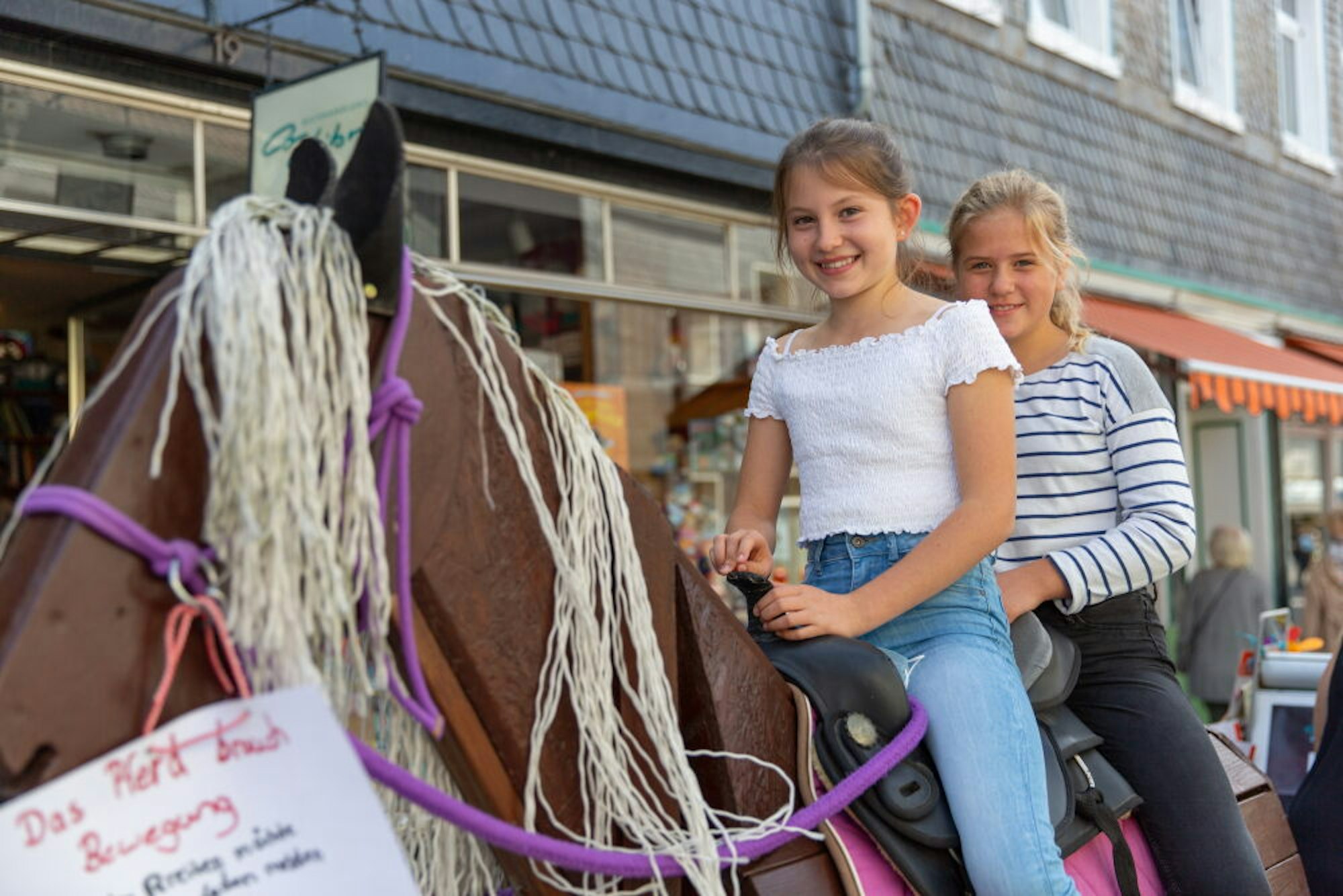 Zum verkaufsoffenen Sonntag hat sich das Colibri-Team auch etwas für Kinder überlegt, denn der 20. September ist Weltkindertag. So konnten die Kinder ein Quiz lösen, um ein Buch zu gewinnen oder sich auf ein Holzpferd setzen. Das Holzpferd gehört eigentlich Emma Hochstein. Die Zehnjährige half mit ihrer Freundin Meggie Wasserfuhr in der Buchhandlung mit.
