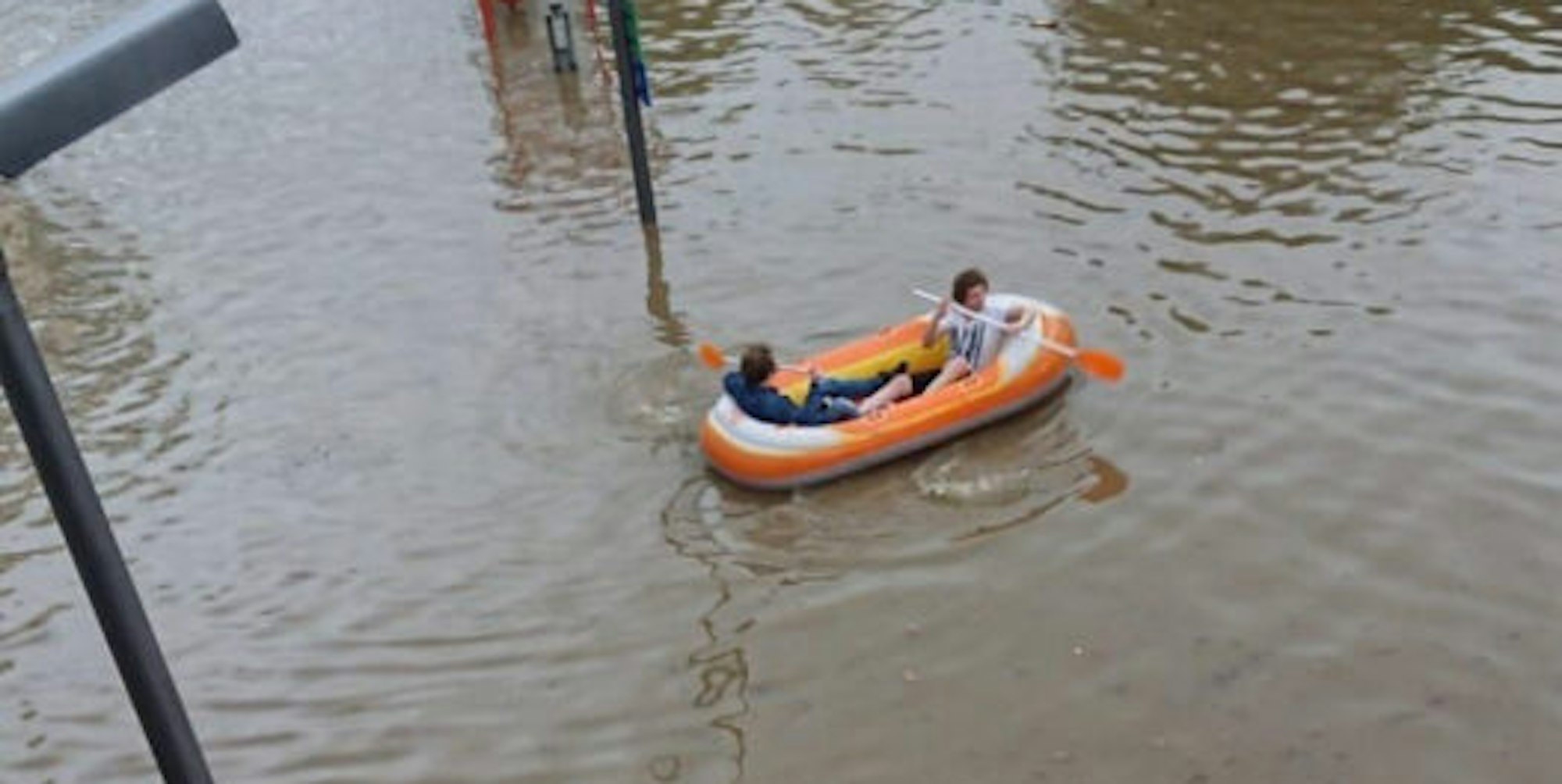 Auch der Busbahnhof stand unter Wasser, das nutzte ein Schlauchbootbesitzer für eine spontane Bootspartie.