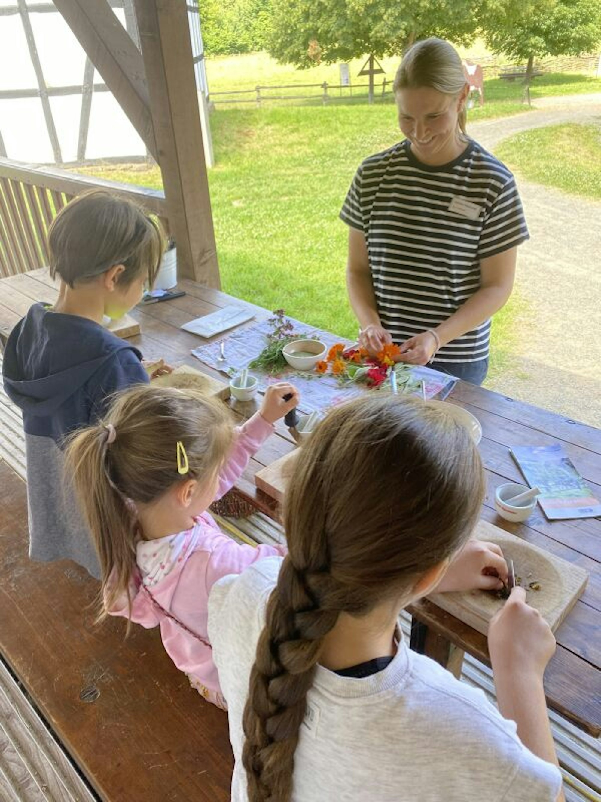 Was man neben bunten Salaten sonst noch anstellen kann mit den Schätzen aus dem Kräutergarten, demonstriert Museumspädagogin Christina Marquardt ein paar Meter weiter. Sie macht gerade mit Elif, Aleya und Malek Kräutersalz für zuhause und Mama Judith Erginay schaut gespannt zu. „Wir werden Brot backen und die Kreationen auf Butter gemeinsam probeessen“, freut sich die Kölnerin schon. Darauf sind auch die Kinder gespannt, die ihre Kreationen erst geduldig zerkleinern und dann mit Meersalz mischen, selbst gemacht bedeutet ein wenig mehr Mühe. Zur Auswahl stehen zwei Varianten: Blütensalz oder mediterrane Art. „Man kann Kräutersalze zwar auch im Supermarkt kaufen, aber da weiß man eben nicht, ob es einem schmeckt und muss den Kostenfaktor beachten“, findet Marquardt und bekommt von der Familie recht, die sich in der Coronazeit eine Winterweide zu einem Nutzgarten umgestaltet hat und nun das Erlebnis vom Samen setzen bis zum fertig Gewachsenen und somit die Wertschätzung für das Selbstgemachte kennen gelernt hat.