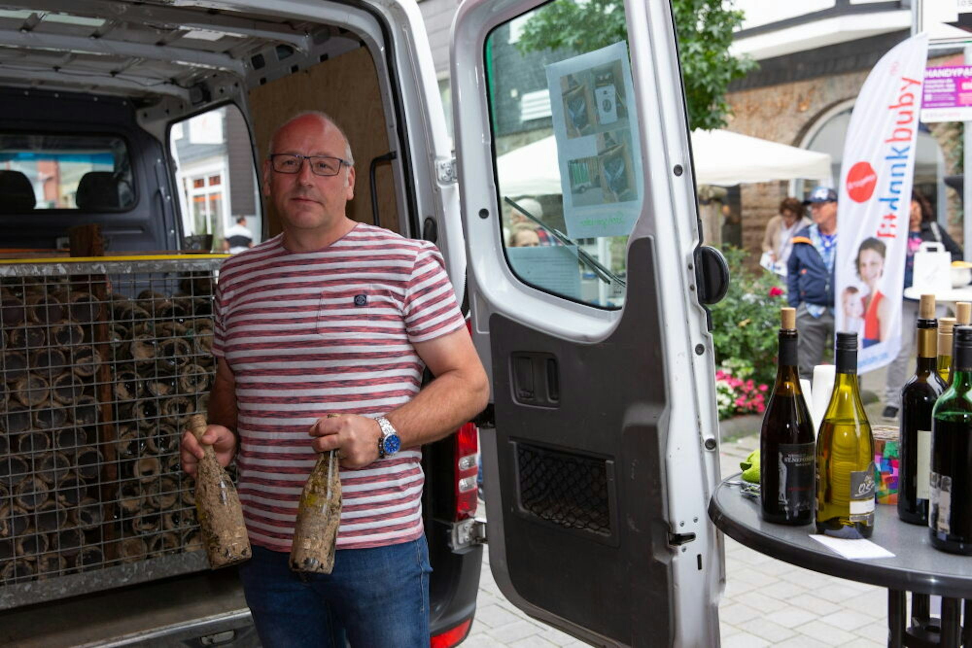 Zu den Händlern gehört Olaf Becker, der „Flutwein“ von der Ahr gegen eine Spende anbot. Der Zuspruch ist groß, zur Freunde von Becker.