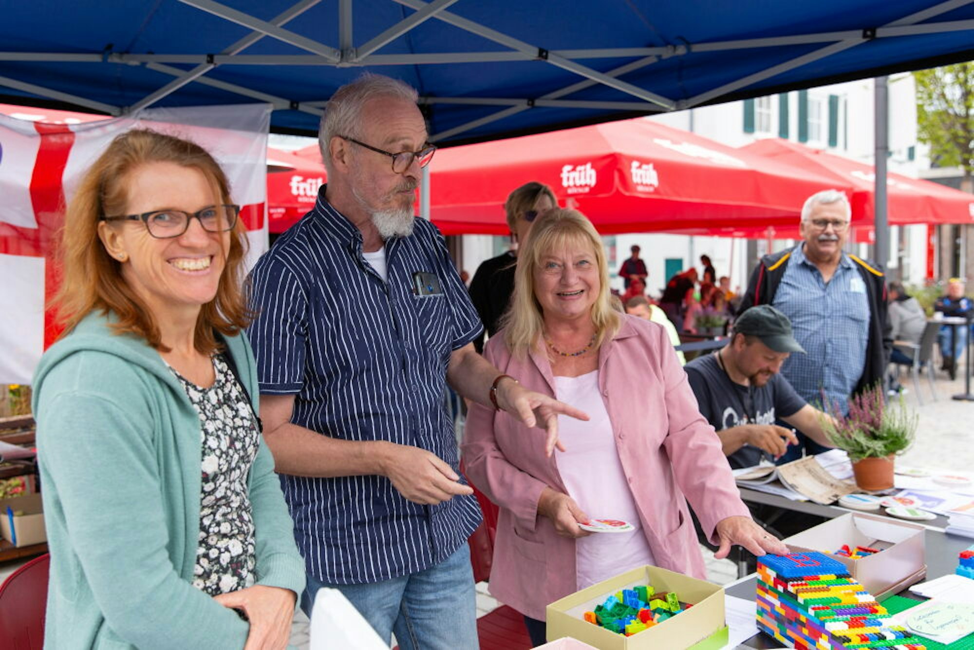 Besonders bunt ging es beim Inklusionsbeirat zu. Dieser sammelt gebrauchte Legosteine, um Rampen zu bauen, die dann vor Geschäften platziert werden sollen, um Menschen mit Beeinträchtigungen oder Eltern mit Kinderwagen den Zugang zu erleichtern. Und siehe da: schon zu Beginn des Tages gab es zwei Eimer Legosteine als Spende. Darüber freuten sich Monika Keller, Thomas van Eimer und ihre Mitstreiter sehr. „Wenn man so eine Rampe mit neuen Legosteinen bauen würde, müsste man über 100 Euro investieren“, erklärte van Eimer. „Ich gebe ein Teil von mir ab, damit andere was davon haben“, so das Motto für die Aktion. „Leute mit Einschränkungen brauchen eine eigene Stimme“, pflichtete Keller ihm bei.