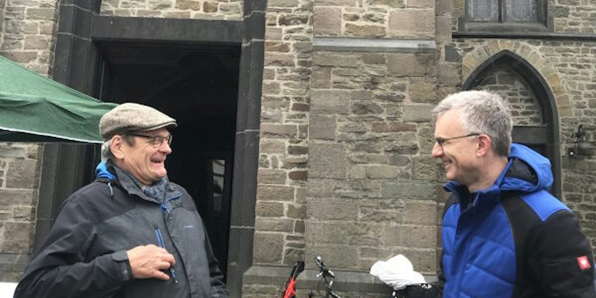 Einladung zum Gespräch: Ansgar Nowak und Henry Wuttke (v.l.) vor der katholischen Kirche in Kreuzberg.