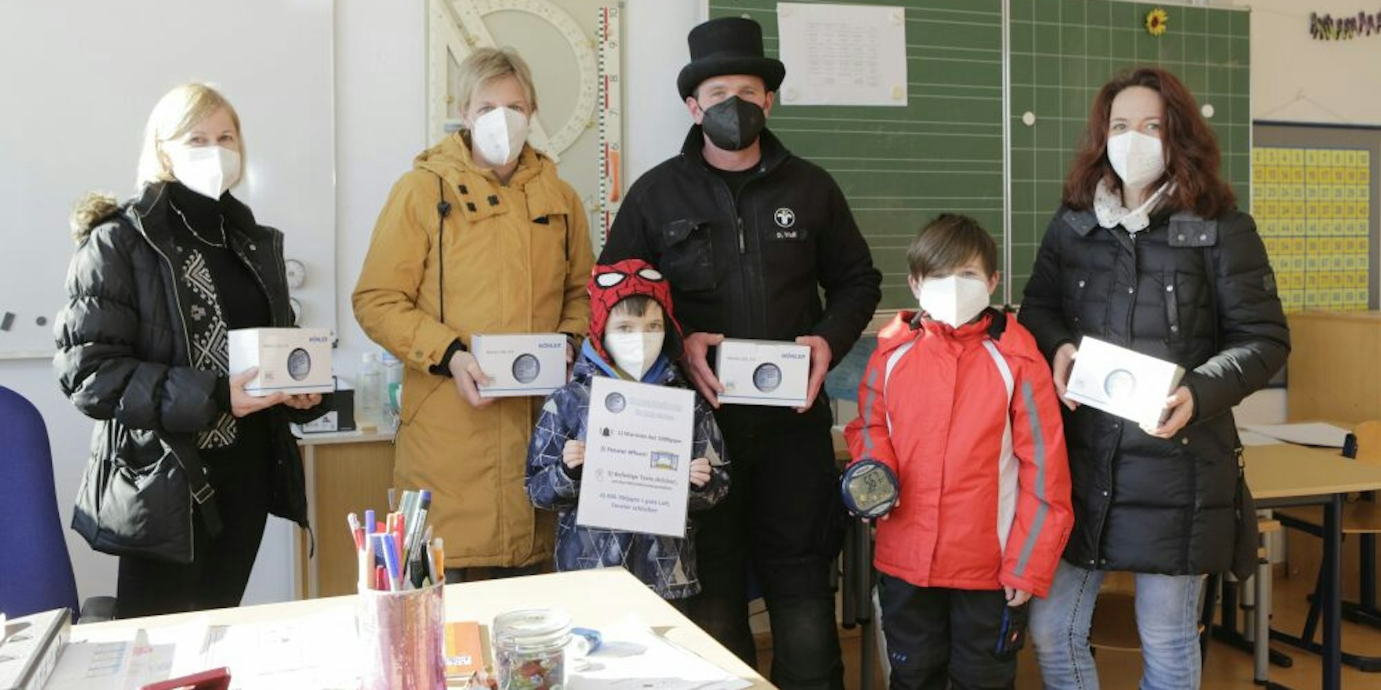 Das hat seinen Grund: Die Melder piepsen, wenn ein bestimmter Wert im Raum überschritten wird – denn das ist das Zeichen zu lüften. Die Hintergründe konnte schon Sohn Lukas Wolf seinen Klassenkameraden erklären: „Wenn es piept, ist die Luft schlecht.“ Er besucht, wie auch sein achtjähriger Bruder Max, die Grundschule an der Ursulinenstraße.