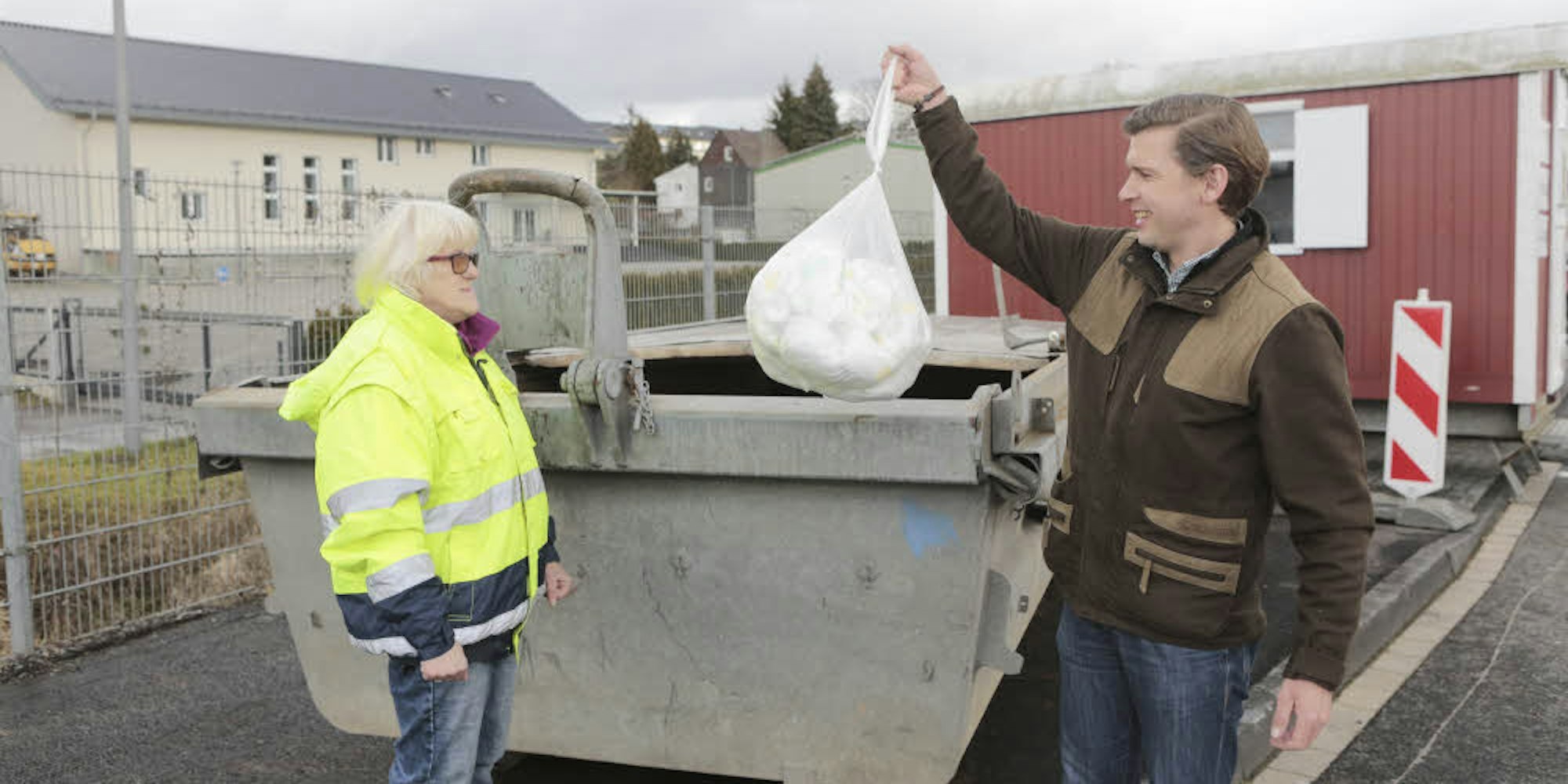 Eine Service für Eltern: Kai Ebert gibt am Bauhof benutzte Windeln ab, Christel Knorr führt Buch.