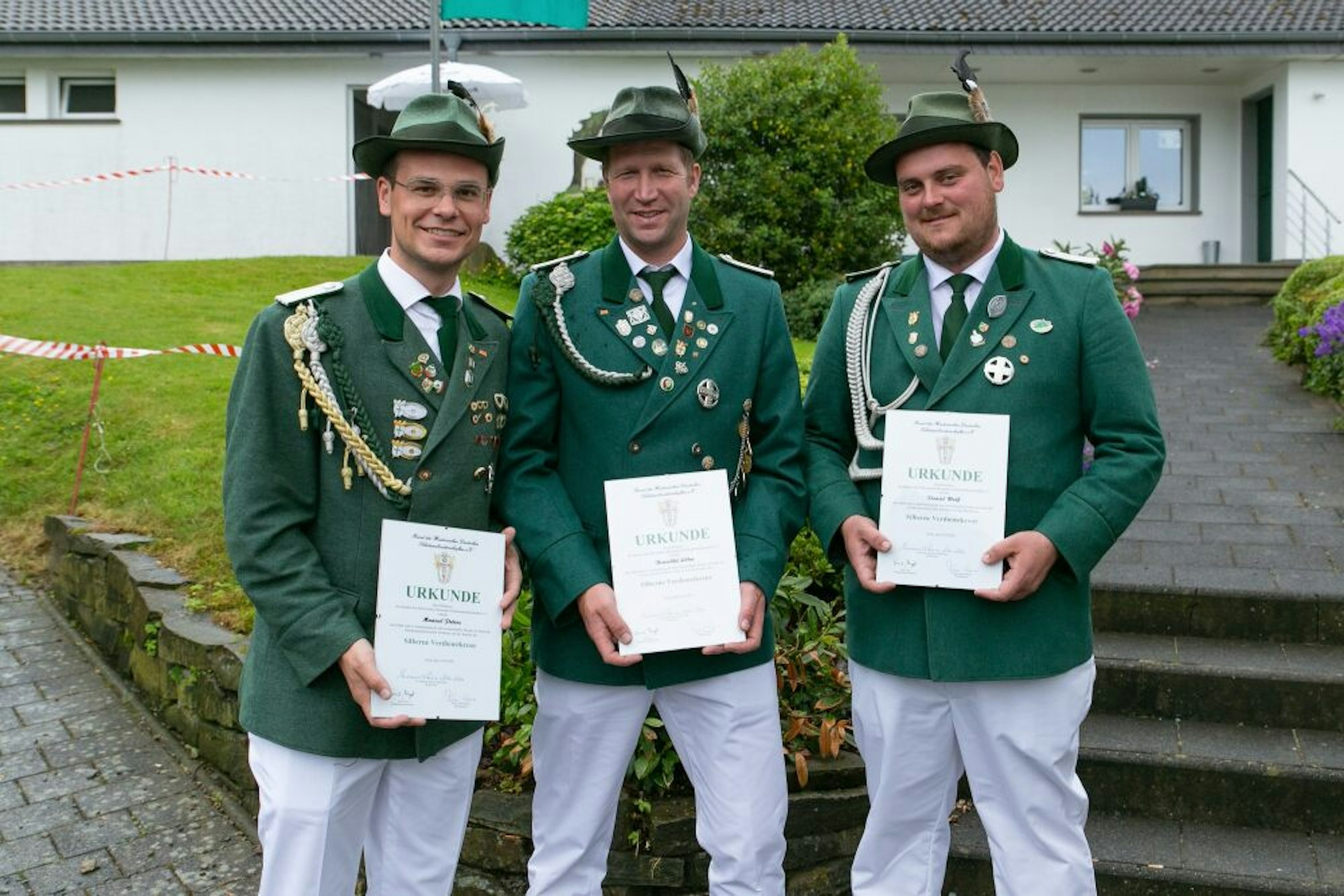 Zudem verliehen Bezirksbrudermeister Ernst-Guido Janssen und der 1. Brudermeister der Hellinger Schützen Ulrich Hüttl drei silberne Verdienstkreuze. Benedikt Löhn, Daniel Wolf und Manuel Peters hatten sich ihr Verdienstkreuz durch langjähriges Engagement im Vorstand verdient.