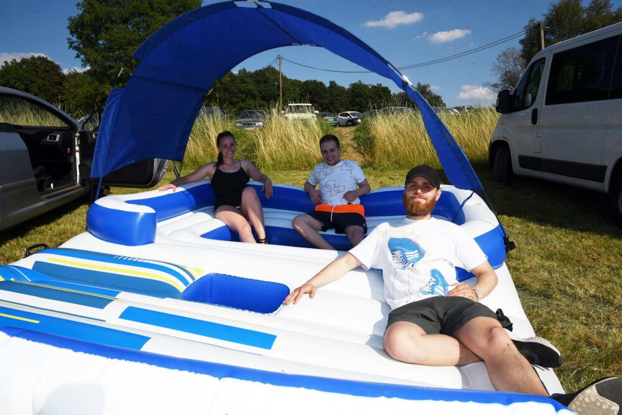 „Wir wollen mit unserer großen Badeinsel, die bis zu sechs Personen Platz bietet, auf die kühle Bever und wir haben keine Corona-Angst, denn hier ist das alles so weitläufig“, sind sich Sergio Leo, Toni Costa und Justina Jähnischen einig.