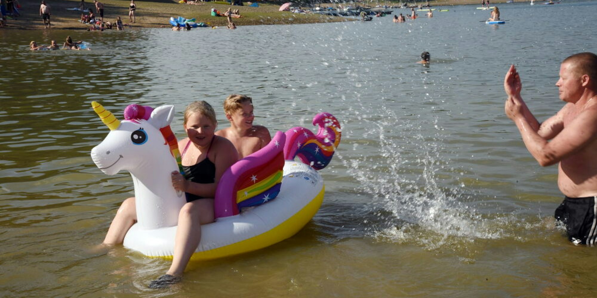 Auch Familie Neumann aus Halver sind mit ihren beiden Kindern wieder an der Bever. „Im Moment sind eben auch unsere Freibäder ausgebucht – das Wasser hier am Ufer vor der „Zornigen Ameise„ ist immer etwas wärmer als im Freibad und das ist für die Kinder angenehmer“, sagt Victor Neumann, während sich seine Kinder Lea und Ilja auf dem schwimmenden Einhorn im Wasser vergnügen.