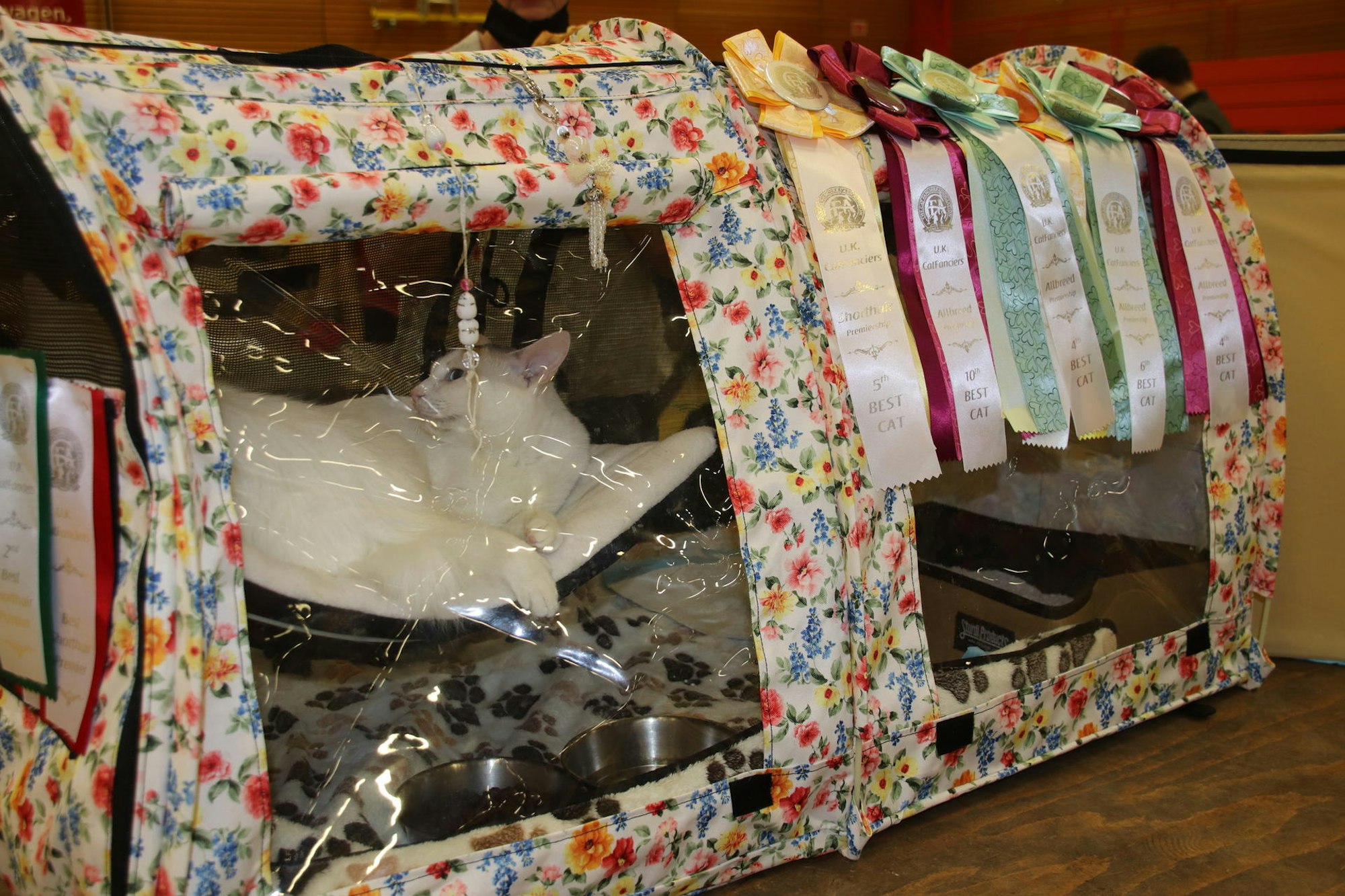 Besonders der fast siebenjährige Kater Hoopsie ist ein Garant für herausragende Platzierungen. Er darf sich „Grand Champion“ nennen, das ist der höchste Titel, den er von der „Cat Fanciers Association“ (CFA), der amerikanischen Organisation für Katzenzucht, bekommen kann.
