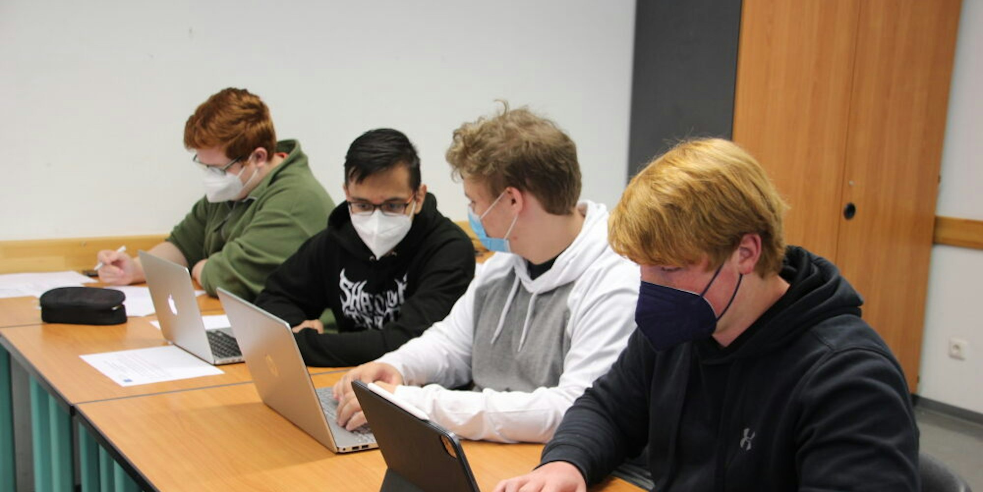 Gemeinsam arbeiten Silas Reck, Paul Kötter, Leon Ueberberg und Oliver Hoffstadt (v.r.) im Chat mit Schülern aus Estland und Slowenien zum Thema Nachhaltigkeit.