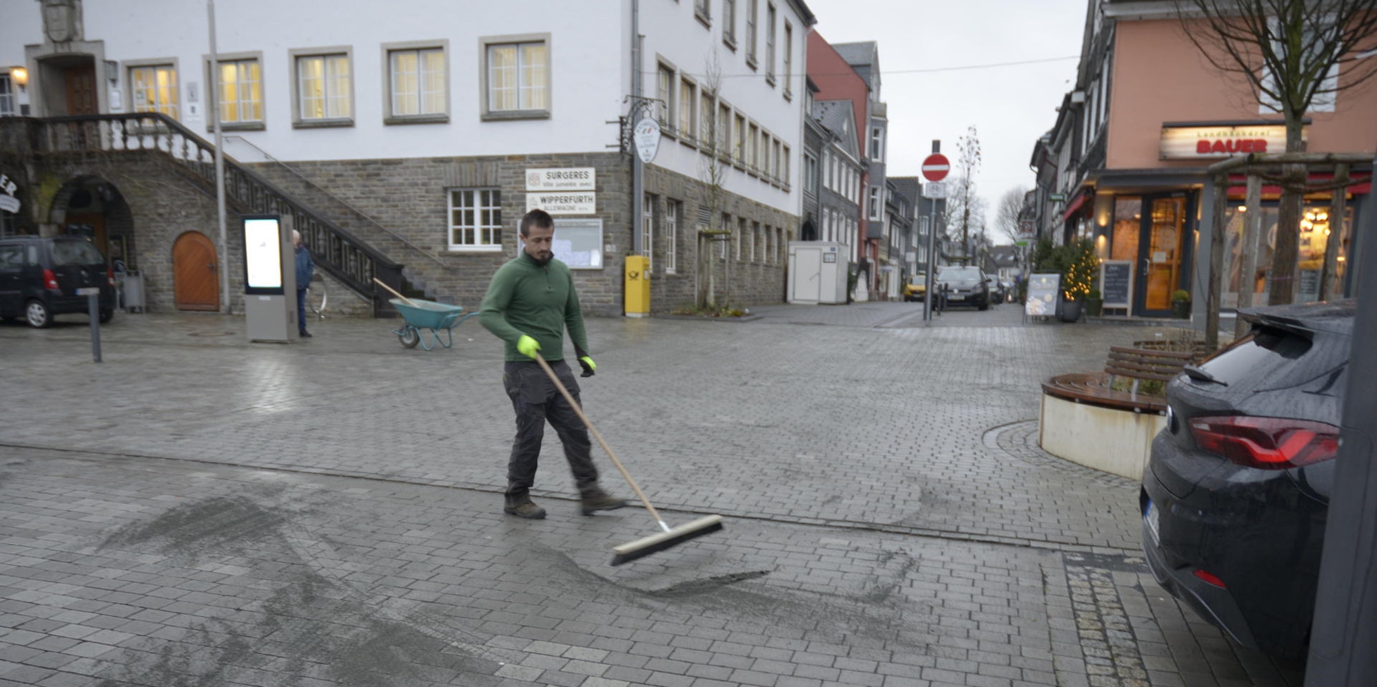 Wipperfürth – Auf dem Marktplatz hat am Dienstagmorgen ein Arbeiter neuen Split in die Fugen der indischen Grauwackesteine gekehrt. Die Maßnahme hatte nichts mit dem Sturz einer Dame zu tun, über den wir kürzlich berichtet haben, sondern es handelt sich nach Auskunft der Stadtverwaltung um Unterhaltungsarbeiten. Zuständig dafür ist die Firma Boymann, die auch die Grauwackesteine auf dem Marktplatz verlegt hat. Die Arbeiten seien Bestandteil der Vertragserfüllung.
