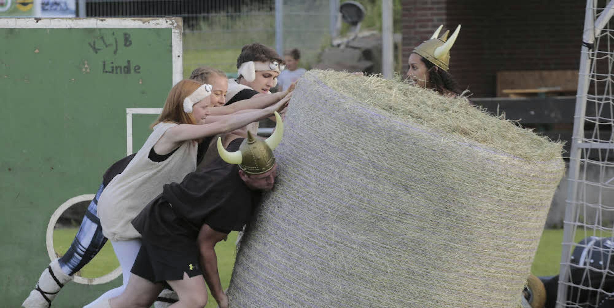 Bereits Stammgast in der Linder Kampfarena ist die SPD Lindlar, die als „Labour Party“ im passenden knallrot-karierten Outfit an den Start geht. Den jüngsten, aber zahlenmäßig stärksten Clan stellen die Linder „Mc Volley“ Volleyballer, die überwiegend mit jungen Frauen ins Feld ziehen. Gleich bei der ersten Disziplin, dem Heuballenrollen, zahlt sich diese Überlegenheit aus. Beim Aufstellen der Rundballen gegen die Uhr dürfen nämlich alle Teammitglieder anpacken.