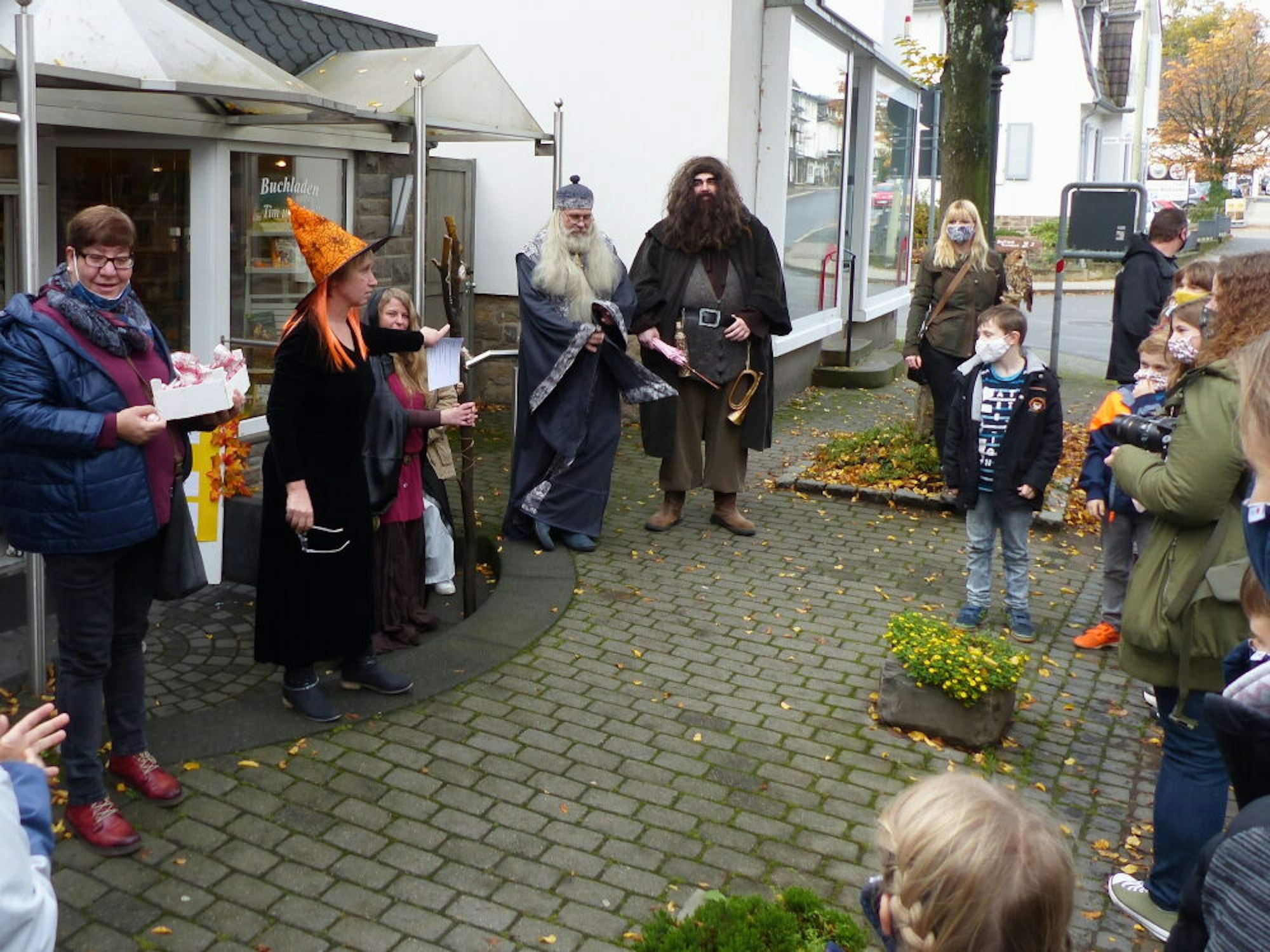 Lindlar – „Da ist Dumbledore“, ruft Timothy sichtlich aufgeregt. Gemeinsam mit seinen beiden Geschwistern und seiner Großmutter Regina Wegener-Ippen wartet er am Samstagmorgen zusammen mit zahlreichen anderen Harry Potter-Fans vor dem Buchladen Tim und Jan auf die zauberhaften Gestalten aus der britischen Romanreihe. „Es ist lange her, dass wir eine Veranstaltung bei uns durchführen konnten. Umso mehr freuen wir uns, dass wir heute Harry Potters Freunde zu Besuch haben“, sagt Dr. Susanne Freese, die den Buchladen an der Hauptstraße führt. Obwohl die Hauptfigur aus den Fantasy-Büchern selbst nicht kommen konnten, sorgten Dumbledore, Hagrid, einige Hexen und vor allem die Eule Hedwig und ihre tierischen Freunde für Begeisterung bei Klein und Groß.
