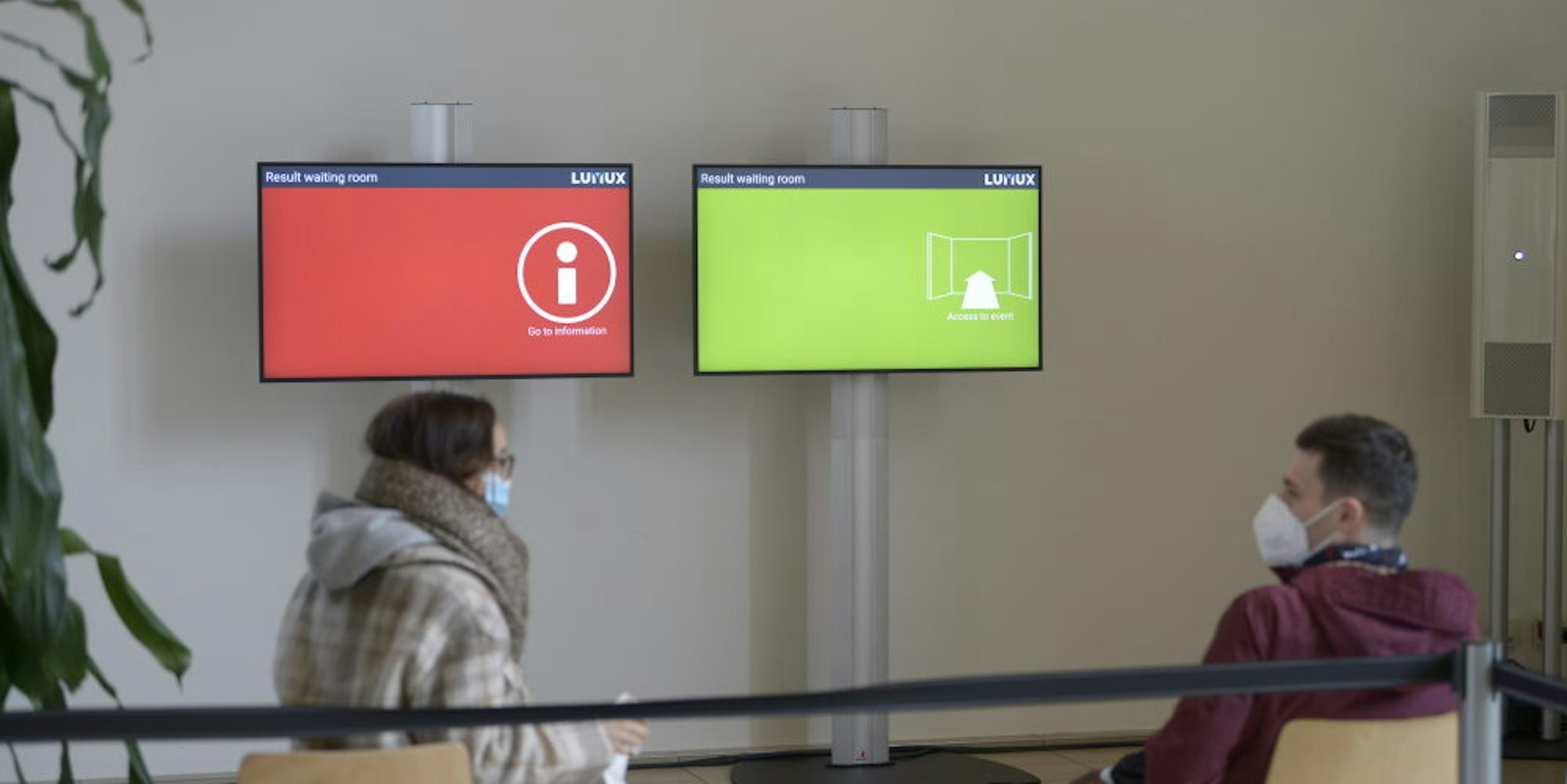 Nach der Messung der Temperatur erfolgt die Registrierung durch den vorher erhaltenen QR-Code. Er ist fest einer Person zugeordnet und kann auch für weitere Tests verwendet werden. Bildschirme zeigen an, ob noch Plätze im Wartebereich frei sind. Kameras erfassen, wie viele Personen sich dort befinden.