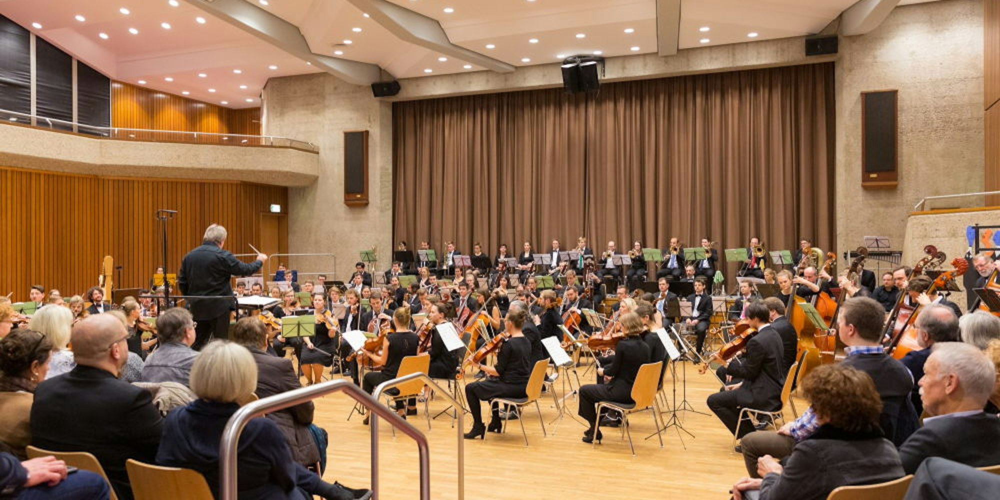 Zurück zum Konzertabend am Sonntag. Um kurz vor 16 Uhr haben die Besucher die Sitzreihen im Saal und auf der Empore gefüllt. „Volles Haus“, freut sich Doris Kisters von Lindlar-Kultur. Die größte Fläche im Saal nehmen an diesem Abend aber nicht die Besucher ein, sondern die Musiker: Ihre Notenständer und Instrumente füllen die gesamte Ebene inmitten des Raumes und sogar auf die Bühne mussten einige Mitglieder des Orchesters ausweichen. „Wir sind wirklich gespannt auf das Stück. Das scheint ja sehr anspruchsvoll zu sein“, sagt das Ehepaar Renz, das in einer der hinteren Reihen zwei Plätze ergattert hat.