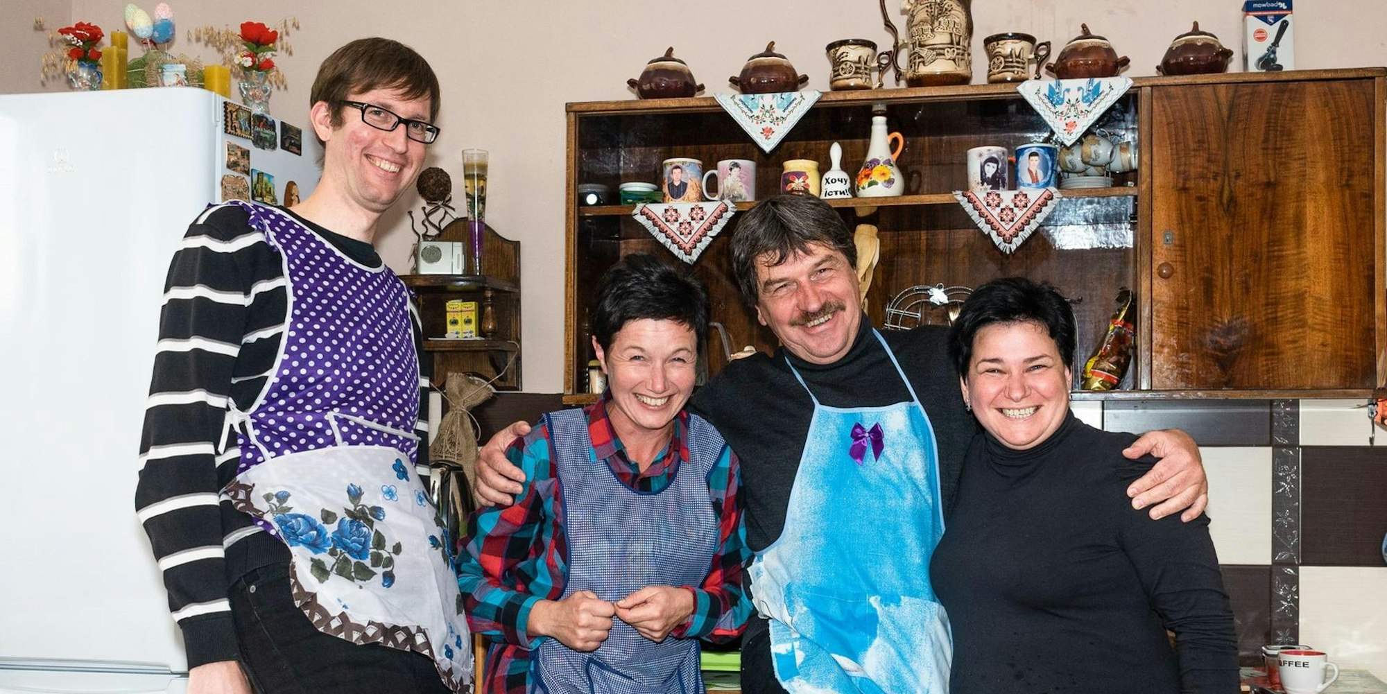 Stephan Hahn und Michael Kamp (l. und 3.v.l.) kochen mit zwei Frauen aus der Ukraine.
