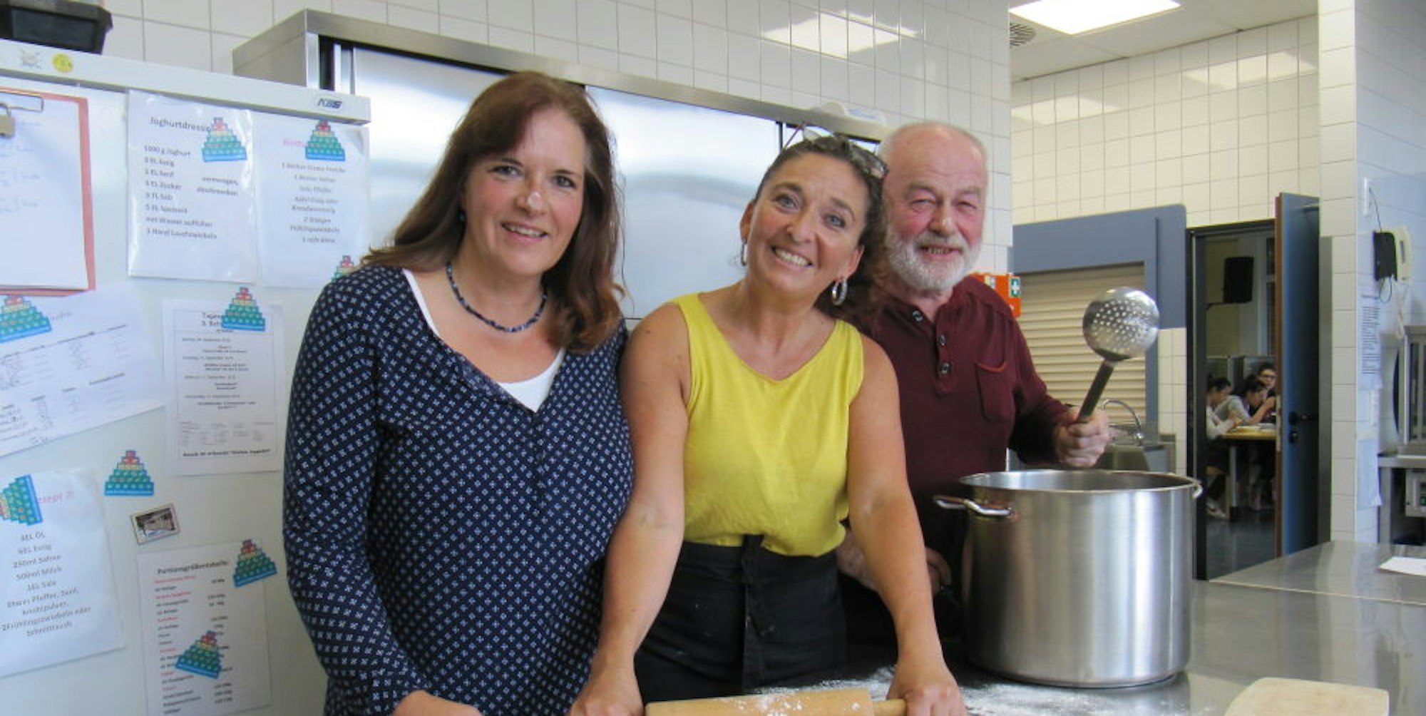 In der Küche der Gemeinschaftshauptschule wird fleißig gekocht. (v.l.) Ökotrophologin Sigrid Sylvester-van Malderen, Chefköchin Sandra Fischer und Manfred Scholz, Vorsitzender des Vereins Mittagstisch der Gemeinschaftshauptschule Lindlar e.V. packen mit an.
