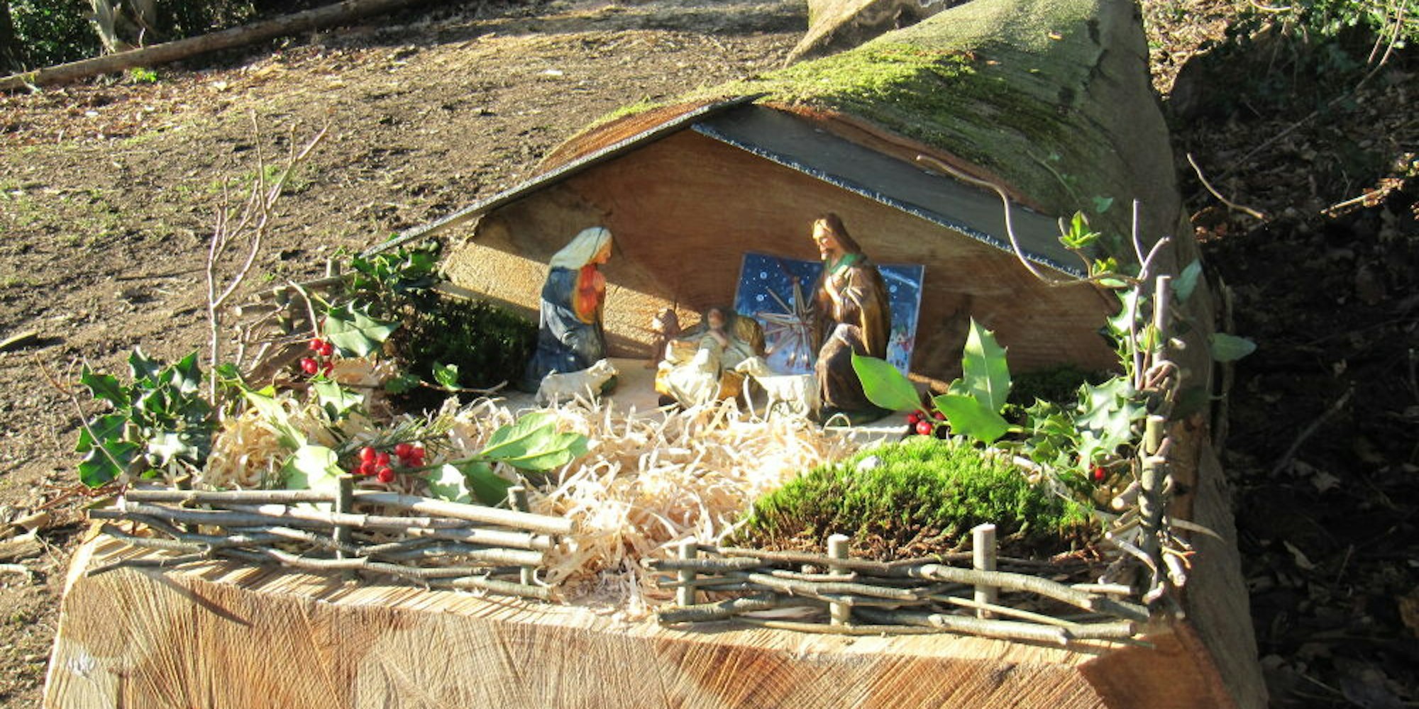 Lindlar – Kurz vor Heiligabend ist diese Weihnachtsszenerie mitten im Wald nahe der Johanneskapelle aufgetaucht. Als Fundament für die Krippe dient ein wuchtiger Buchenstamm, der mit rund einem Meter Durchmesser schon für sich ein Hingucker ist. Viel Mühe hat sich der Erbauer gemacht und die Hauptdarsteller der Heiligen Nacht in eine Landschaft aus Moos, Ilex und Holzwolle gesetzt. Umrundet wird alles mit Weidezaun. Zwei Schieferplatten verhindern, dass es dem Kind in die Wiege regnet.