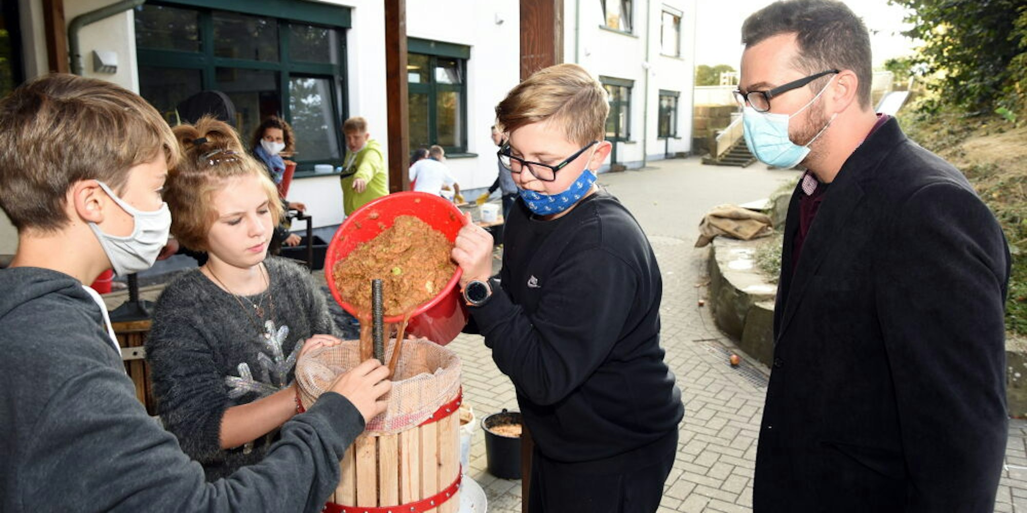 Coronabedingt fand nun allerdings nur eine Übergabe im kleinen Rahmen statt. Während die Schüler, die an dem Projekt „Raus auf die Streuobstwiese“ beteiligt waren, das dort gesammelte Obst zu Saft verarbeiten, war André Spans zu Besuch in der Antoniusschule, um das Projekt zu unterstützen und die Auszeichnung zu übergeben. Kai Dehler freute sich sehr über die Auszeichnung und kündigte an, dass sich die Schule auch in Zukunft weiter für die Kampagnen werben möchte, um die dritte Stufe zu erreichen.