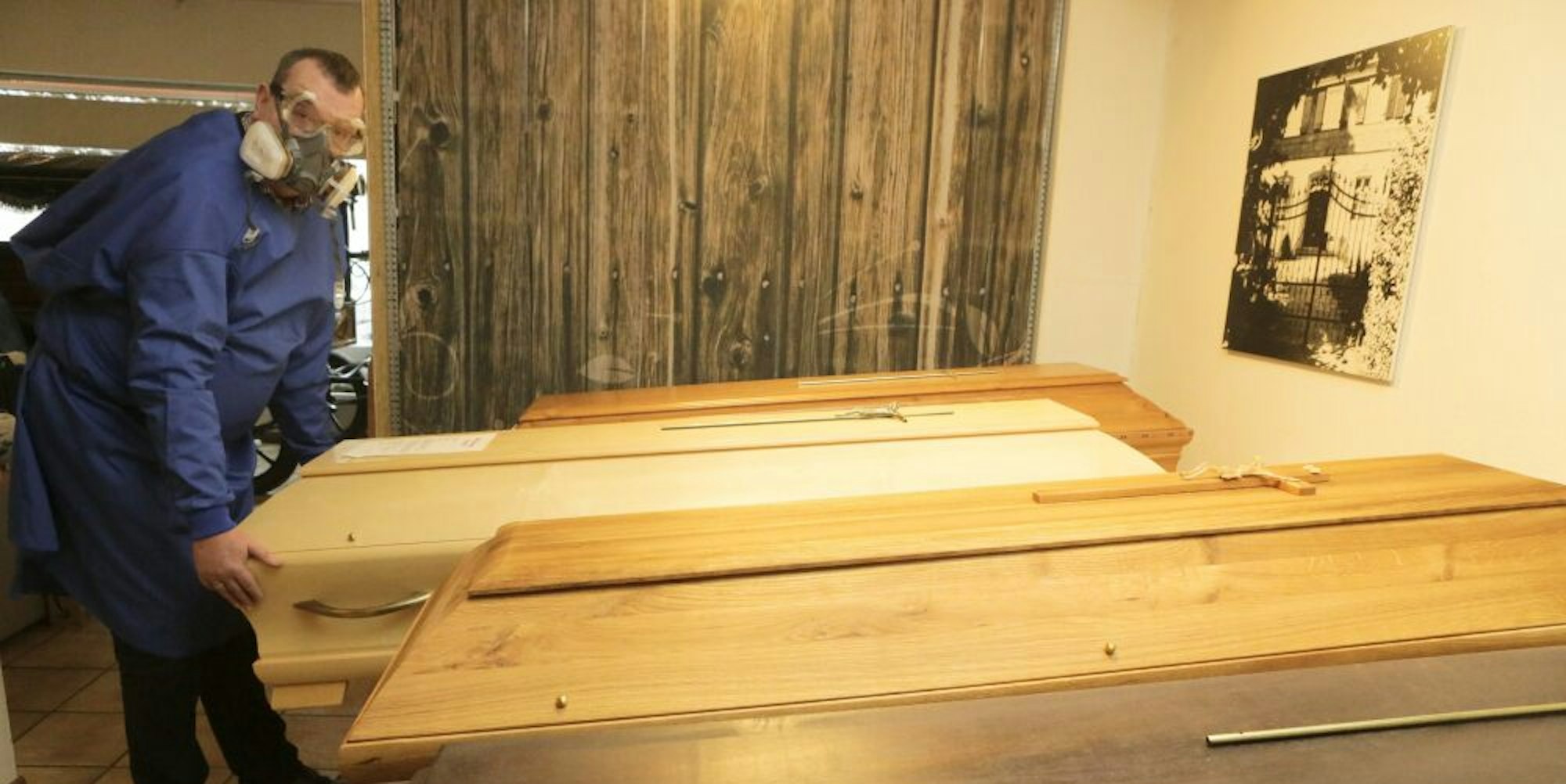 Särge im Lager zeigt hier Bestatter Christoph Hachenberg, er hat zur Demonstration Schutzkleidung angelegt.