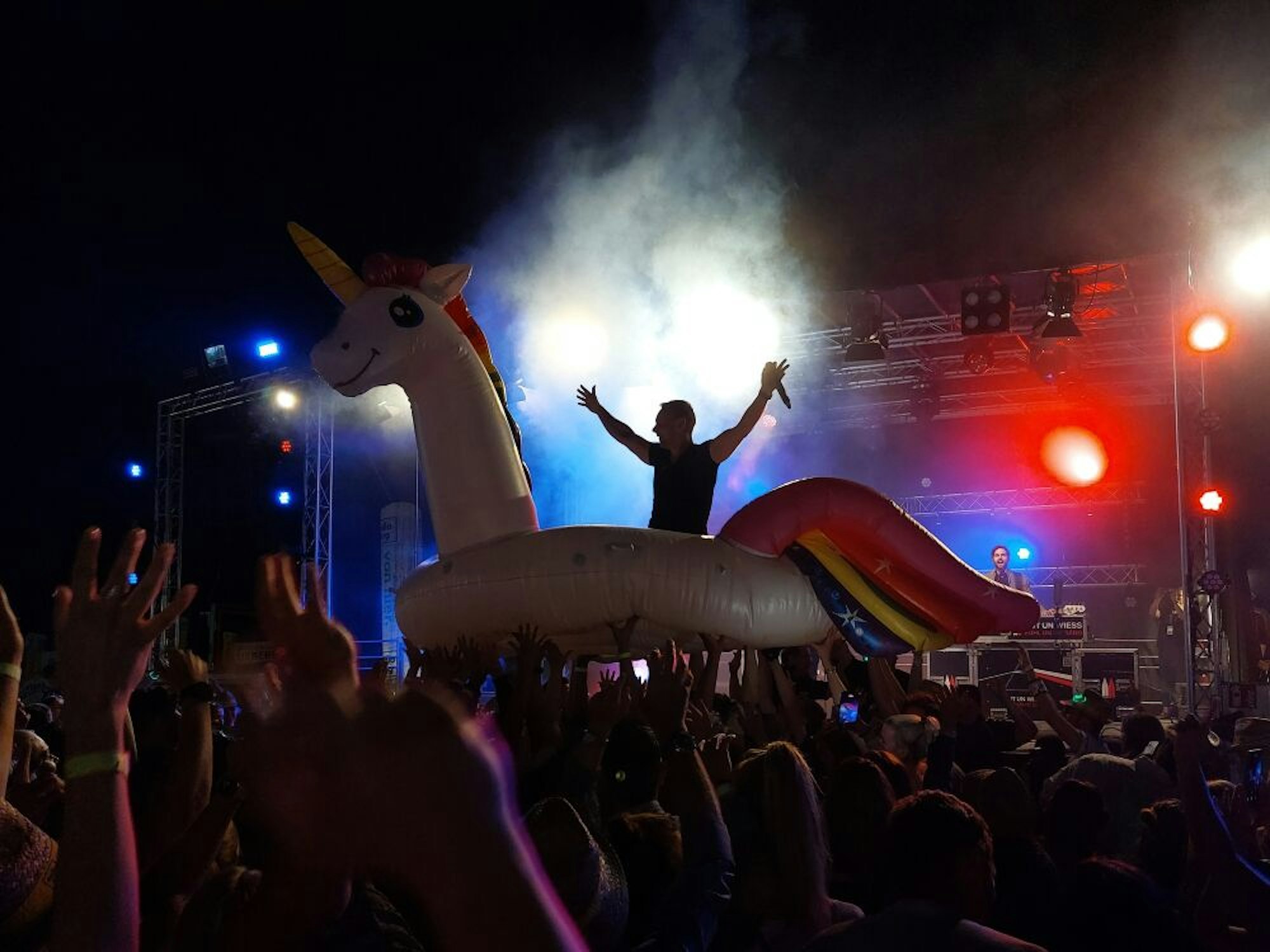 Der Sänger von „Kuhl un de Gäng“ wurde auf einem aufblasbaren Einhorn durchs Publikum getragen.