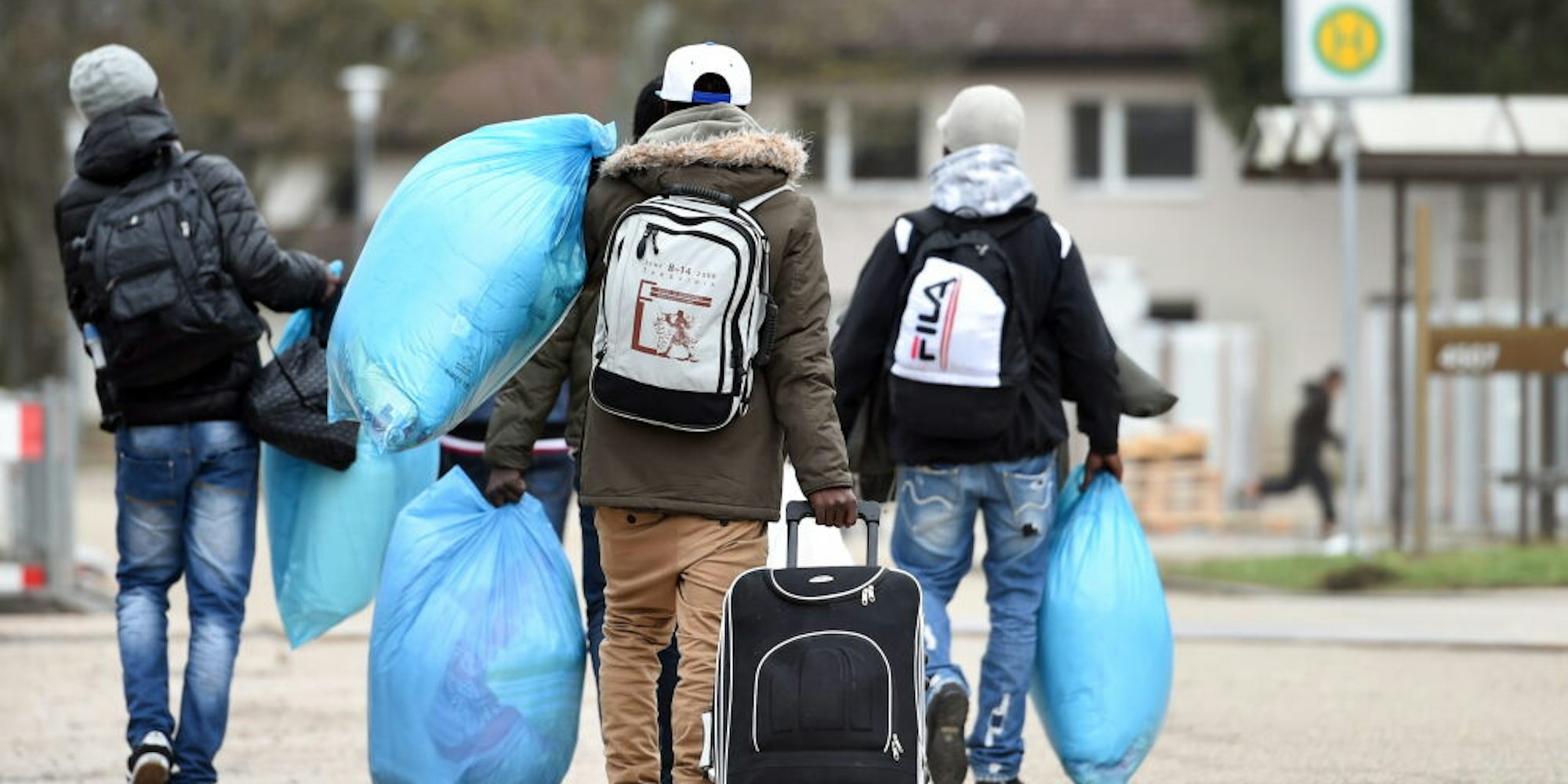 Flüchtlinge tragen ihr Gepäck in eine Unterkunft.