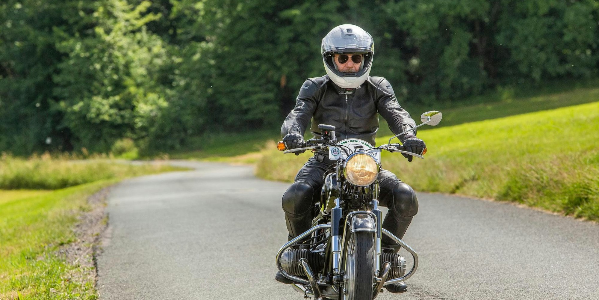 Eine alte „Schwingen-BMW“ unterwegs bei der Rallye „Moto Classic“ auf einer kleinen oberbergischen Straße.